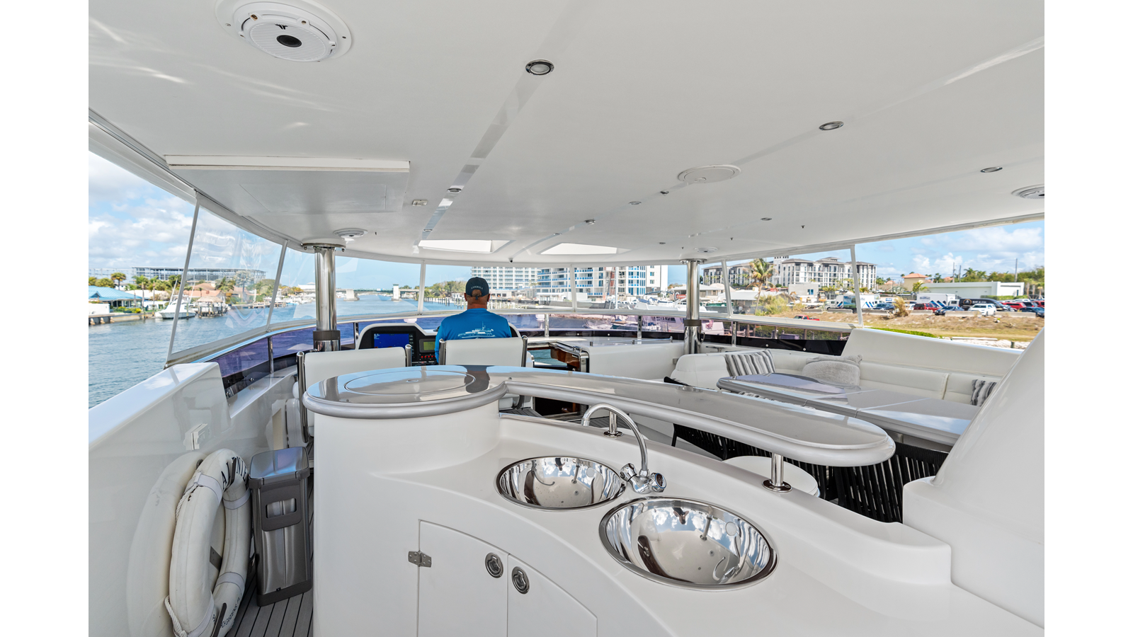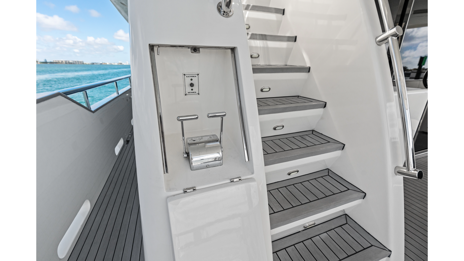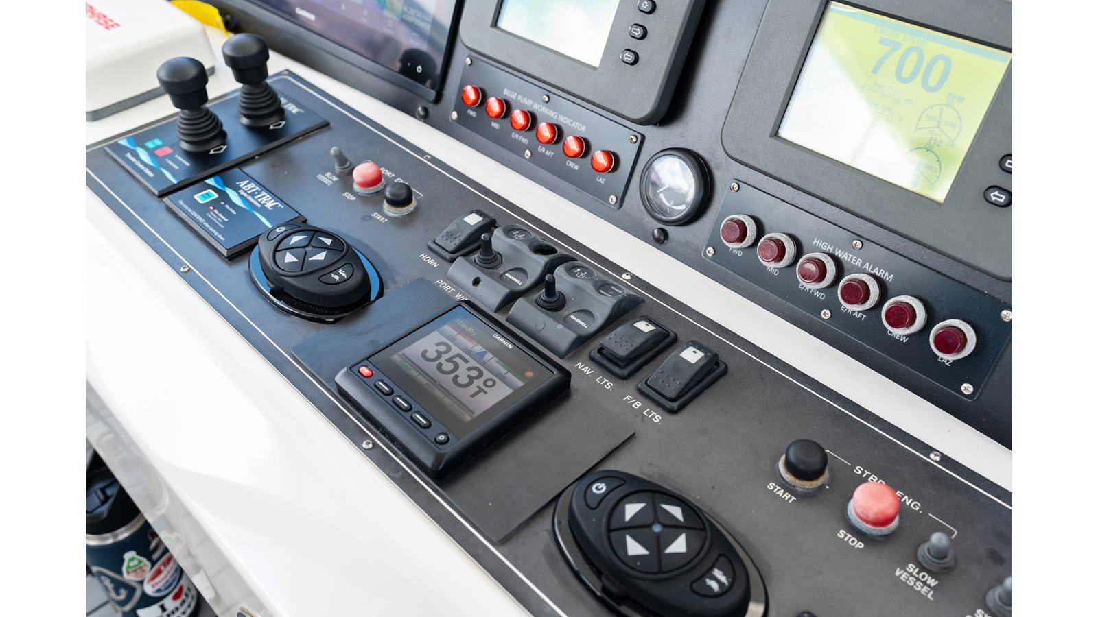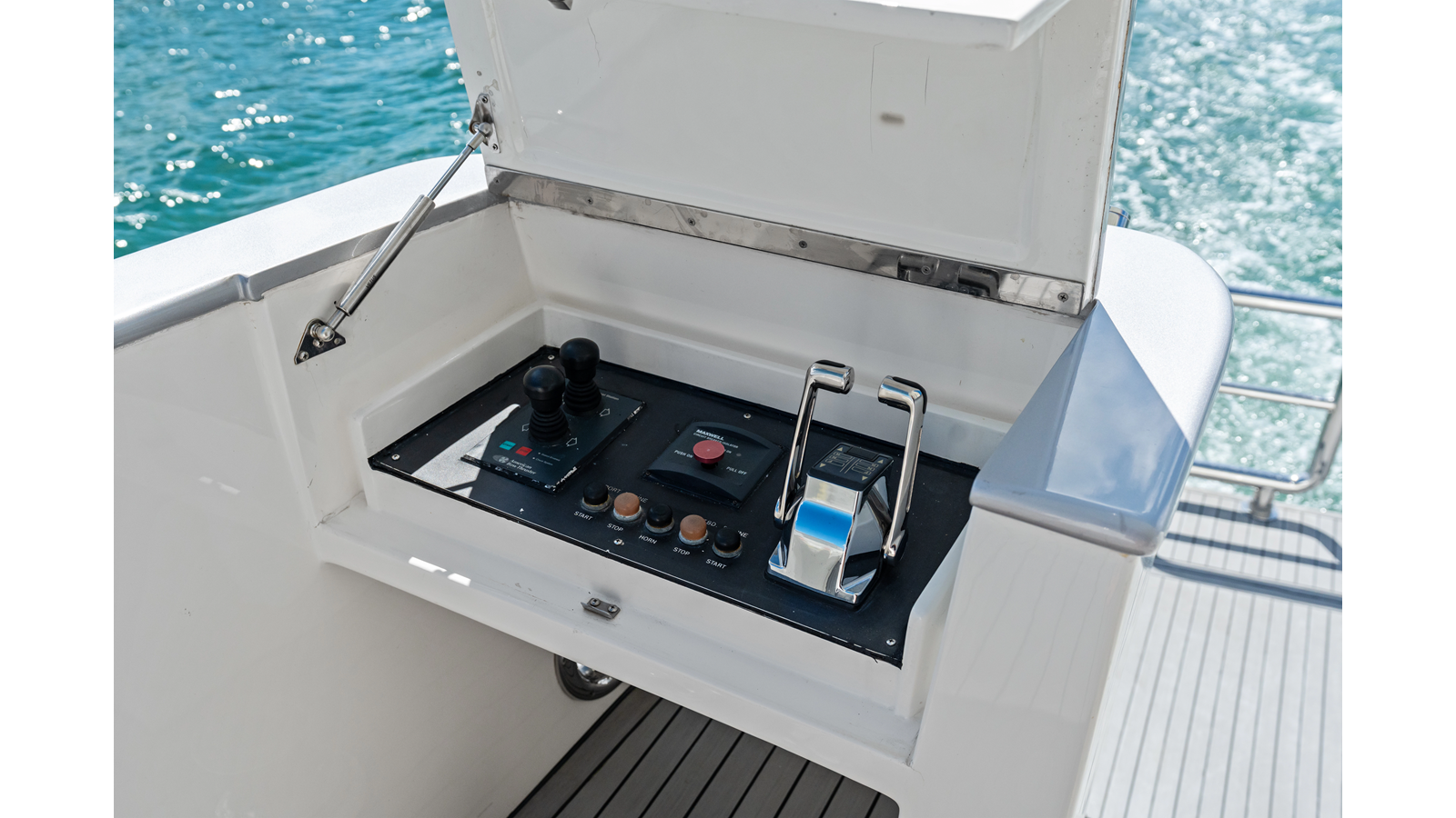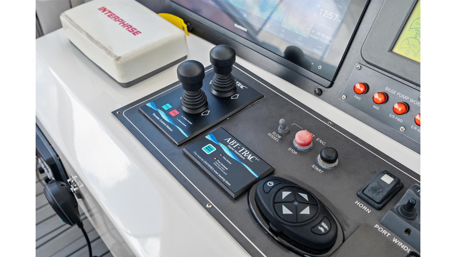 This is especially evident in the spacious salon and country kitchen with atrium, while still offering large walk-around side decks and four separate boarding areas. She is equipped with ABT Trac fins for stabilization, hydraulic bow and stern thrusters, and Dockmate wireless control, allowing navigation from anywhere onboard. Additionally, there are two auxiliary steering stations (port and starboard) on the aft main deck, as well as controls on the flybridge and raised pilothouse (RPH).