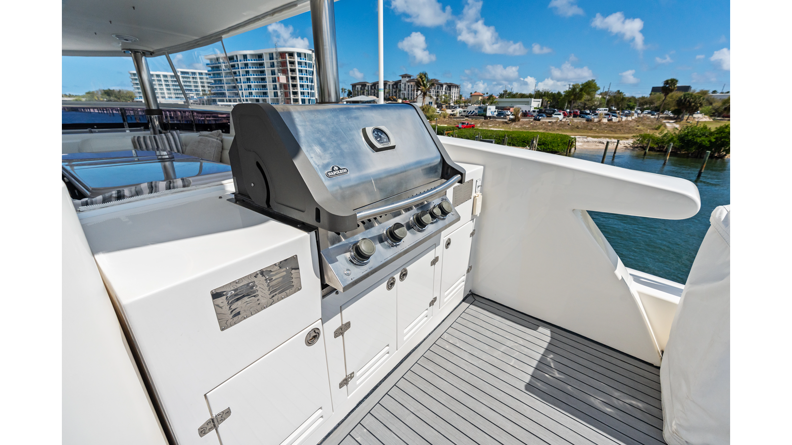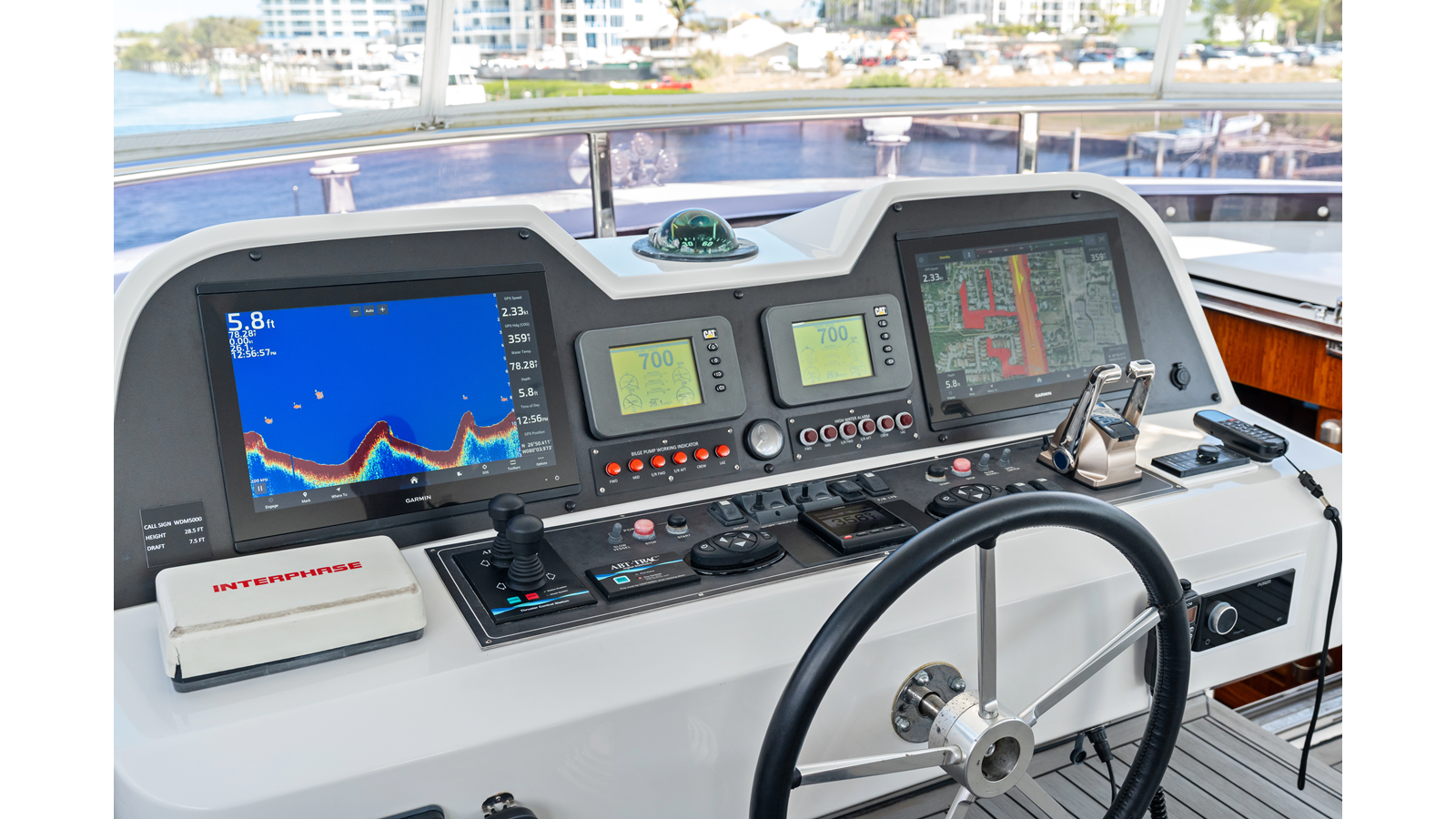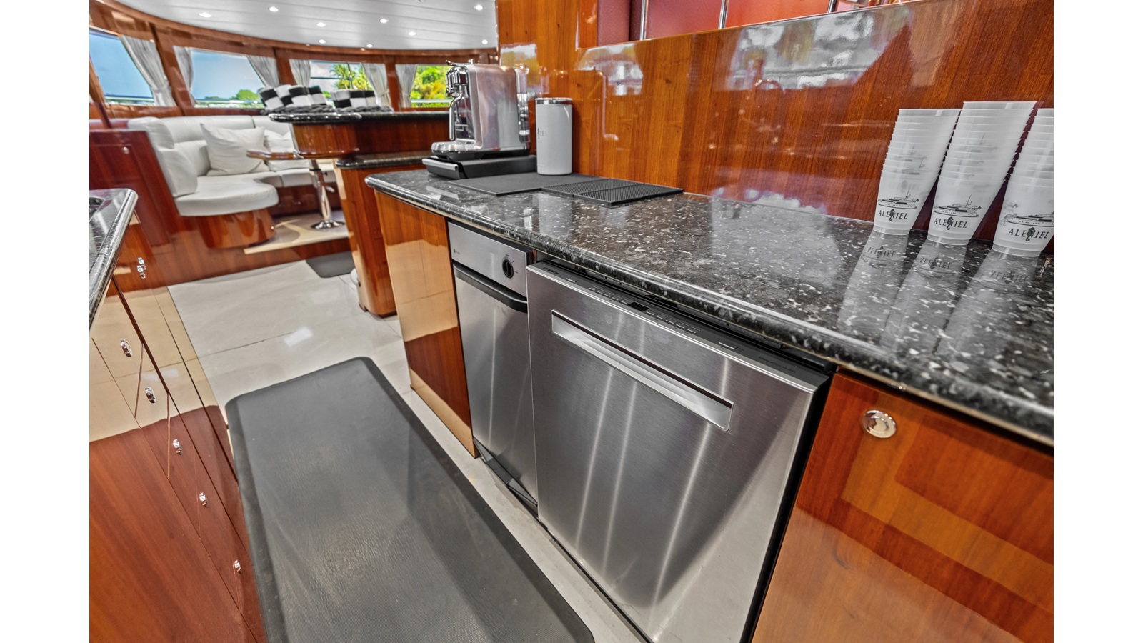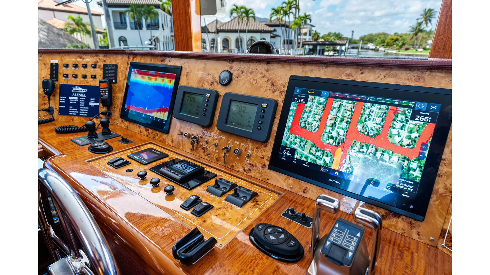 This is especially evident in the spacious salon and country kitchen with atrium, while still offering large walk-around side decks and four separate boarding areas. She is equipped with ABT Trac fins for stabilization, hydraulic bow and stern thrusters, and Dockmate wireless control, allowing navigation from anywhere onboard. Additionally, there are two auxiliary steering stations (port and starboard) on the aft main deck, as well as controls on the flybridge and raised pilothouse (RPH).