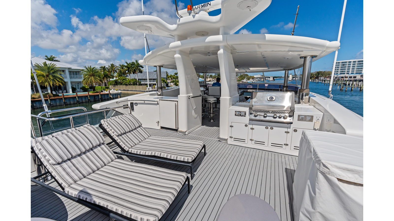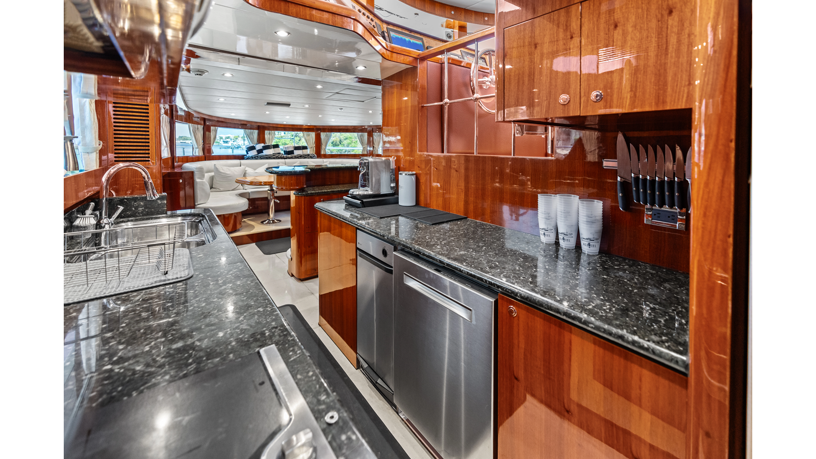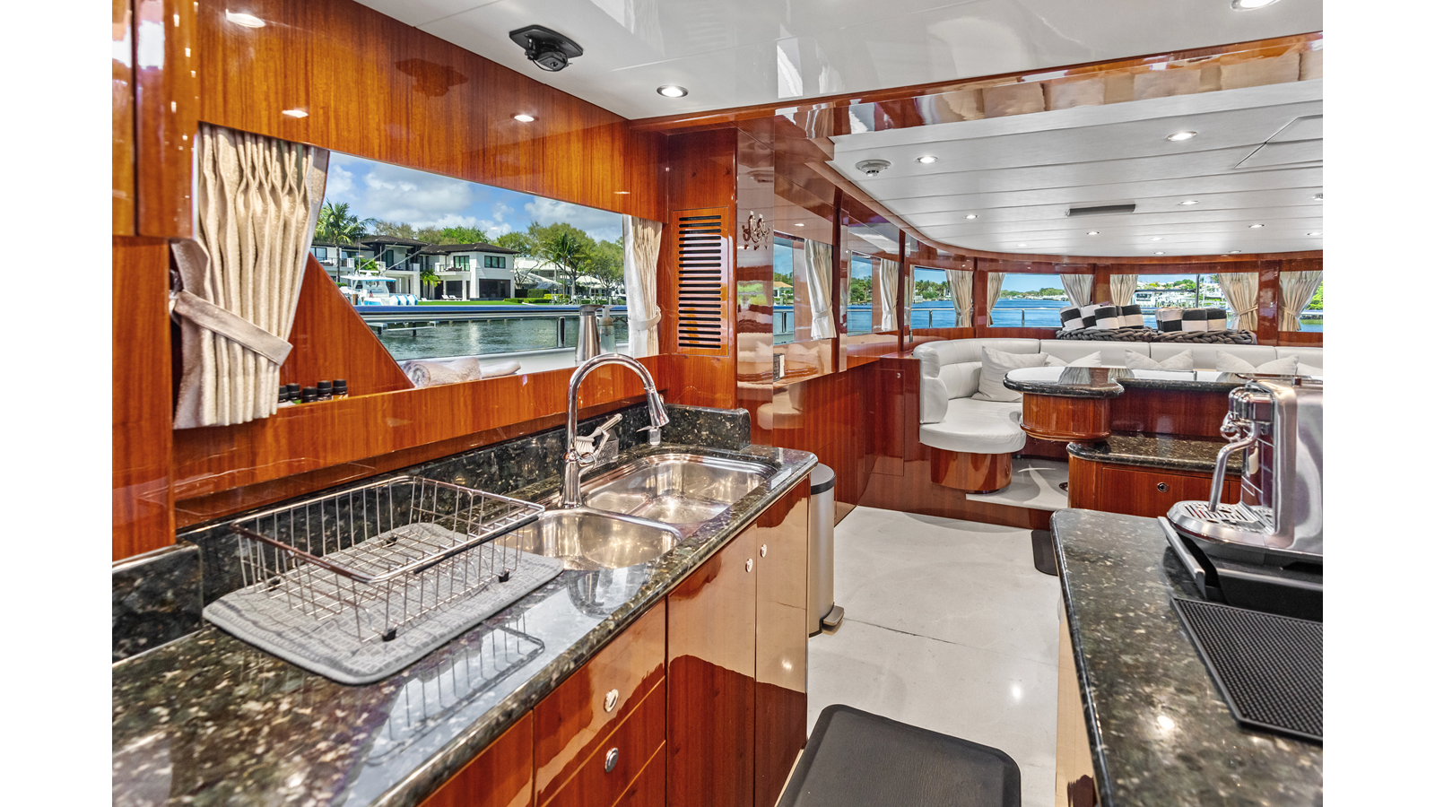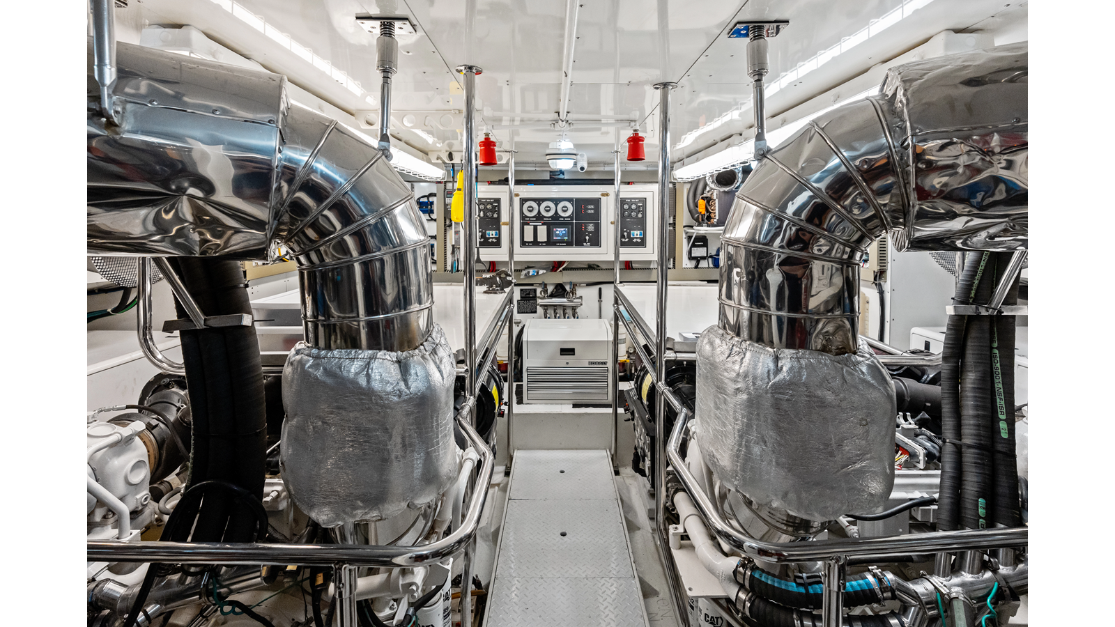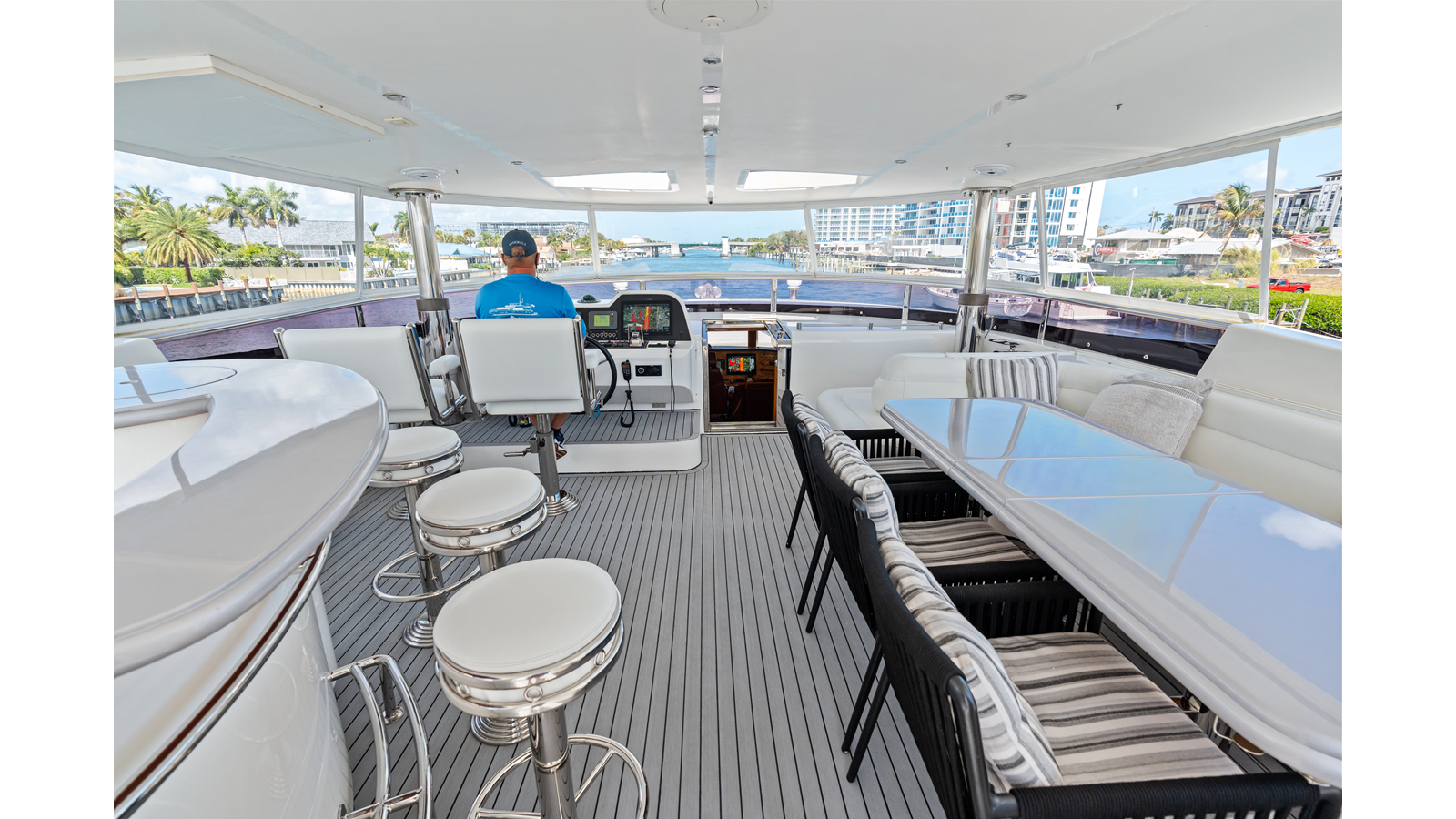 This is especially evident in the spacious salon and country kitchen with atrium, while still offering large walk-around side decks and four separate boarding areas. She is equipped with ABT Trac fins for stabilization, hydraulic bow and stern thrusters, and Dockmate wireless control, allowing navigation from anywhere onboard. Additionally, there are two auxiliary steering stations (port and starboard) on the aft main deck, as well as controls on the flybridge and raised pilothouse (RPH).