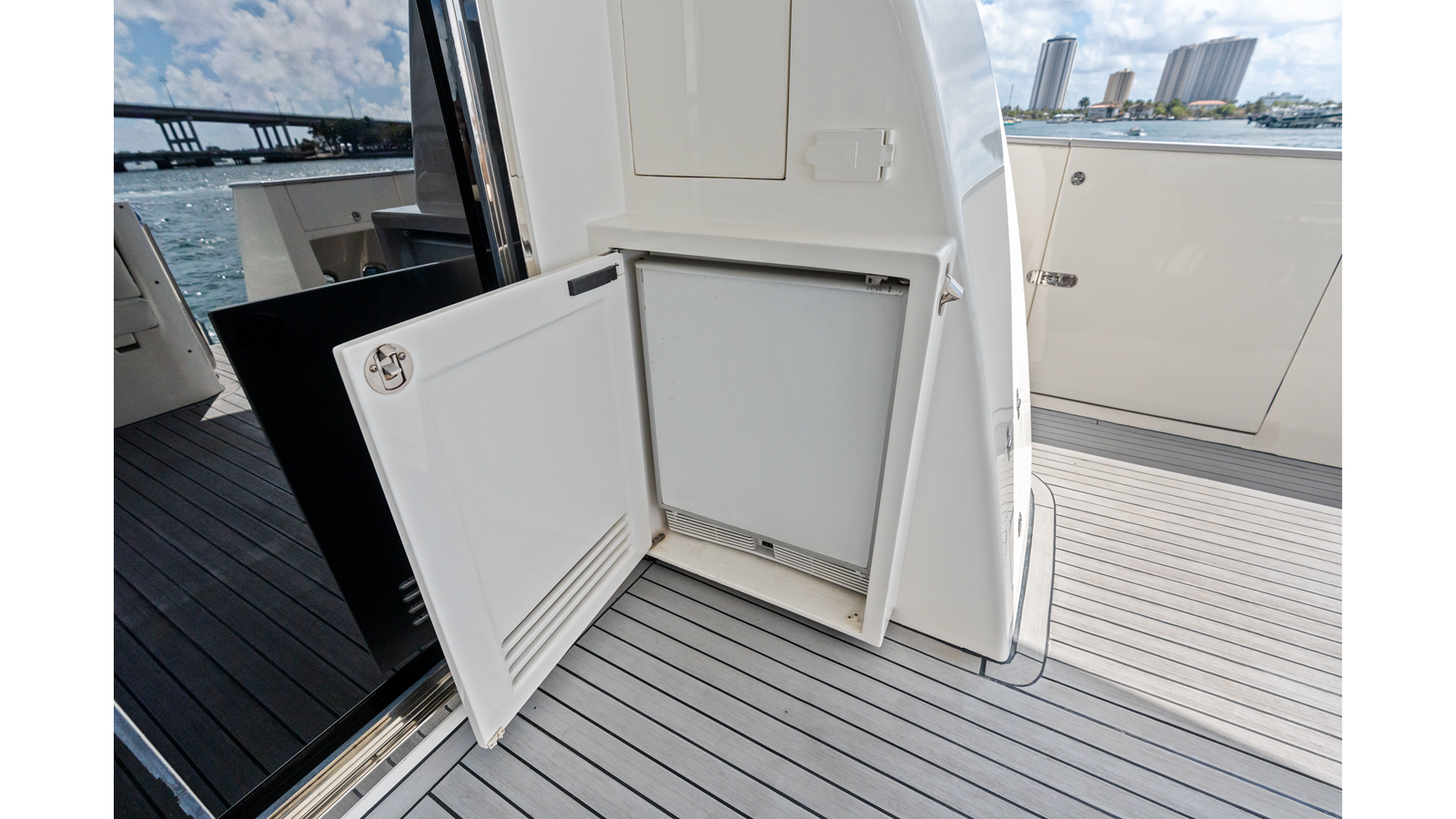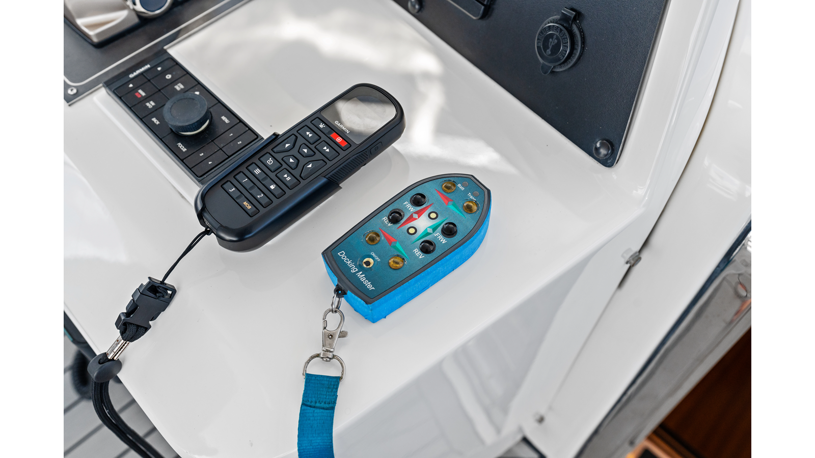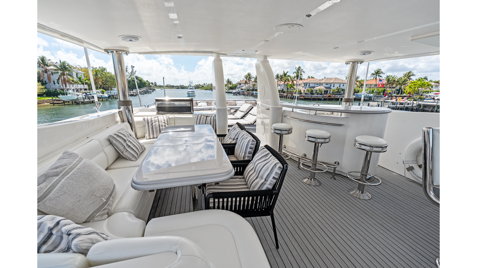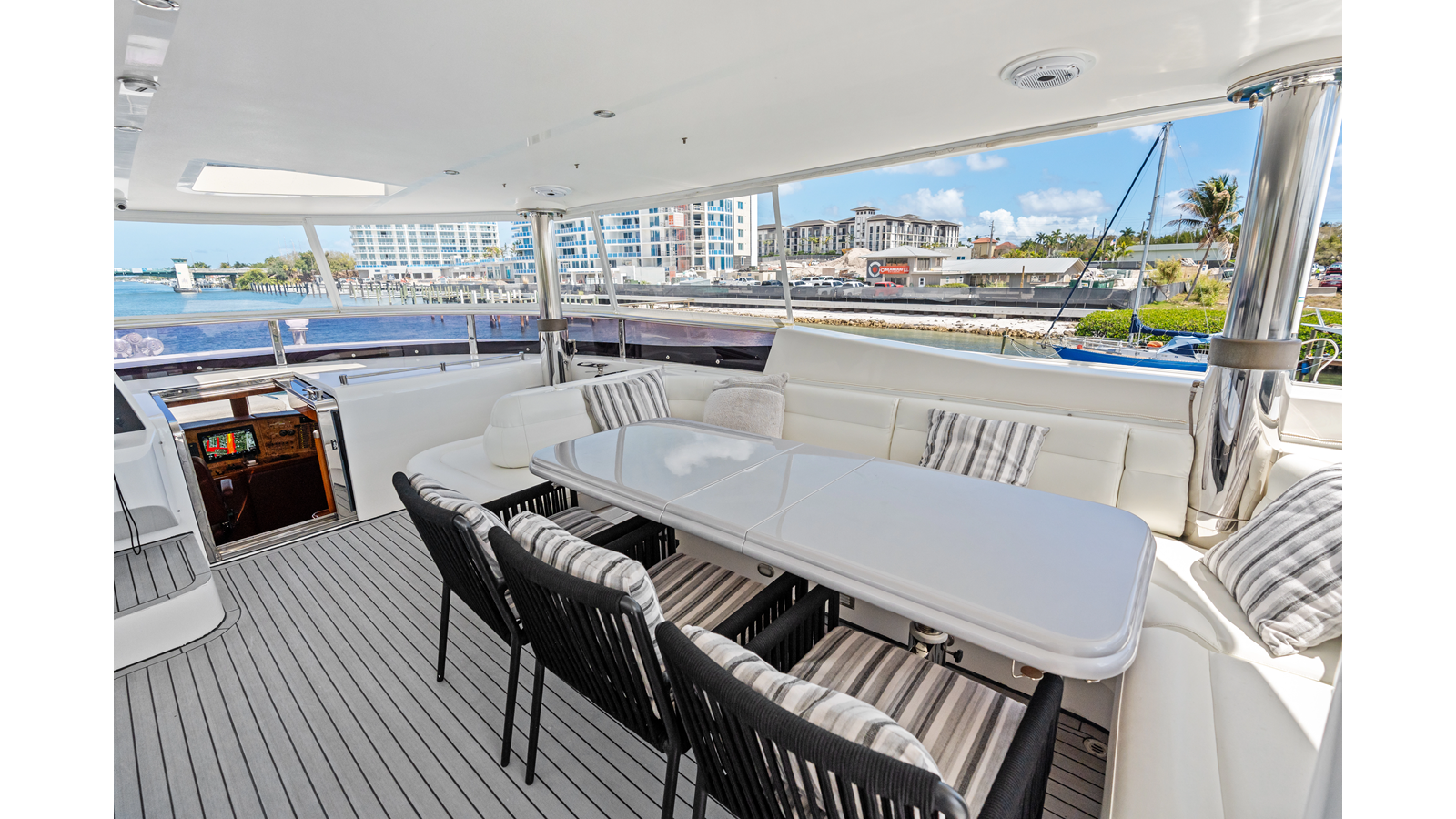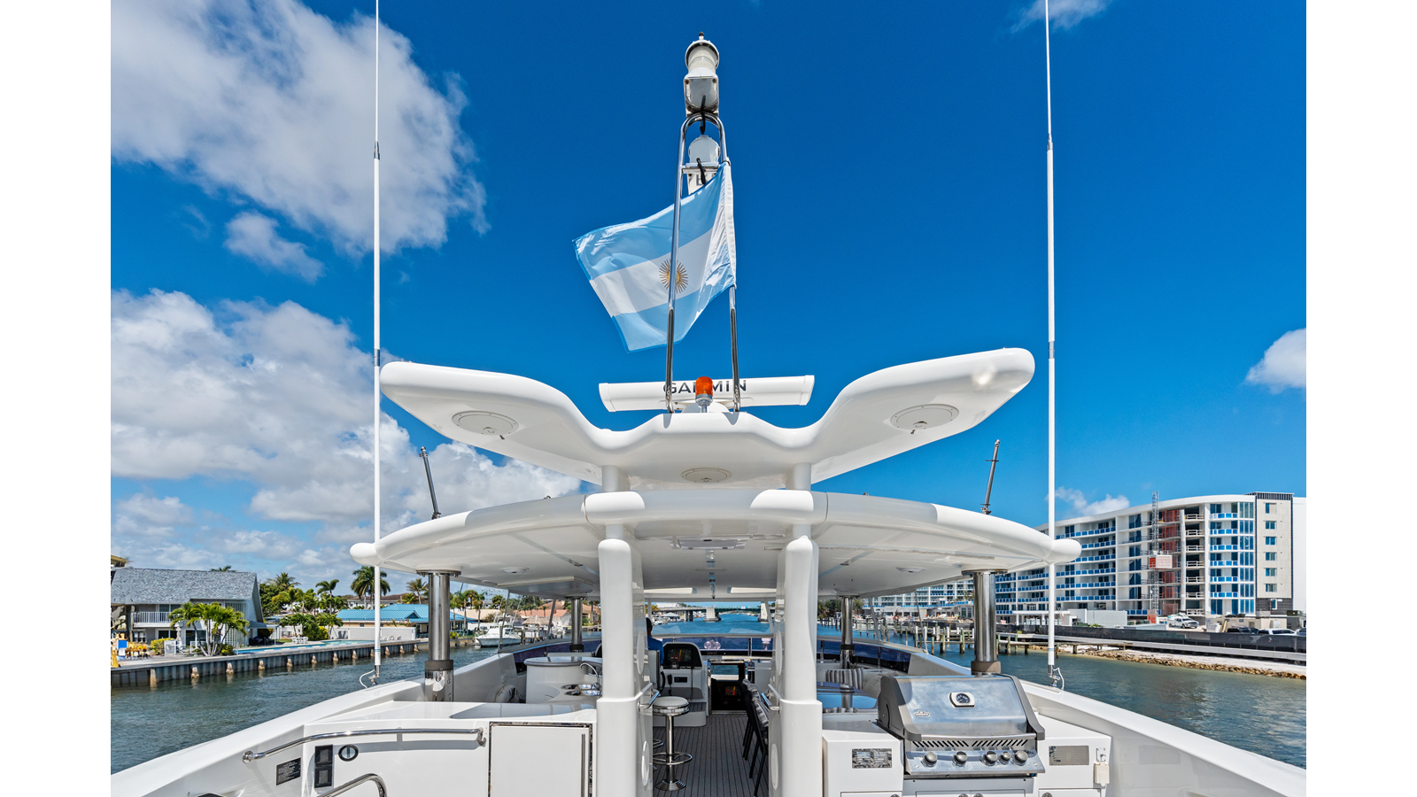 This is especially evident in the spacious salon and country kitchen with atrium, while still offering large walk-around side decks and four separate boarding areas. She is equipped with ABT Trac fins for stabilization, hydraulic bow and stern thrusters, and Dockmate wireless control, allowing navigation from anywhere onboard. Additionally, there are two auxiliary steering stations (port and starboard) on the aft main deck, as well as controls on the flybridge and raised pilothouse (RPH).