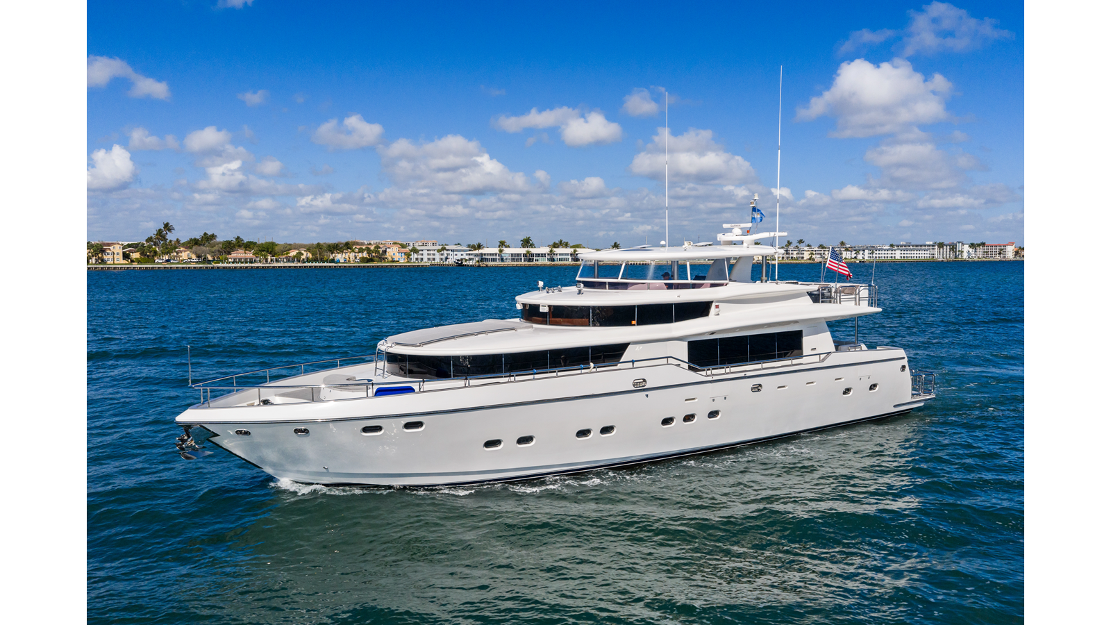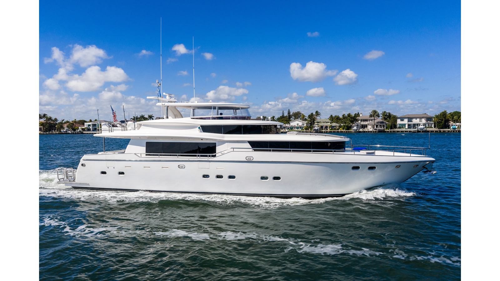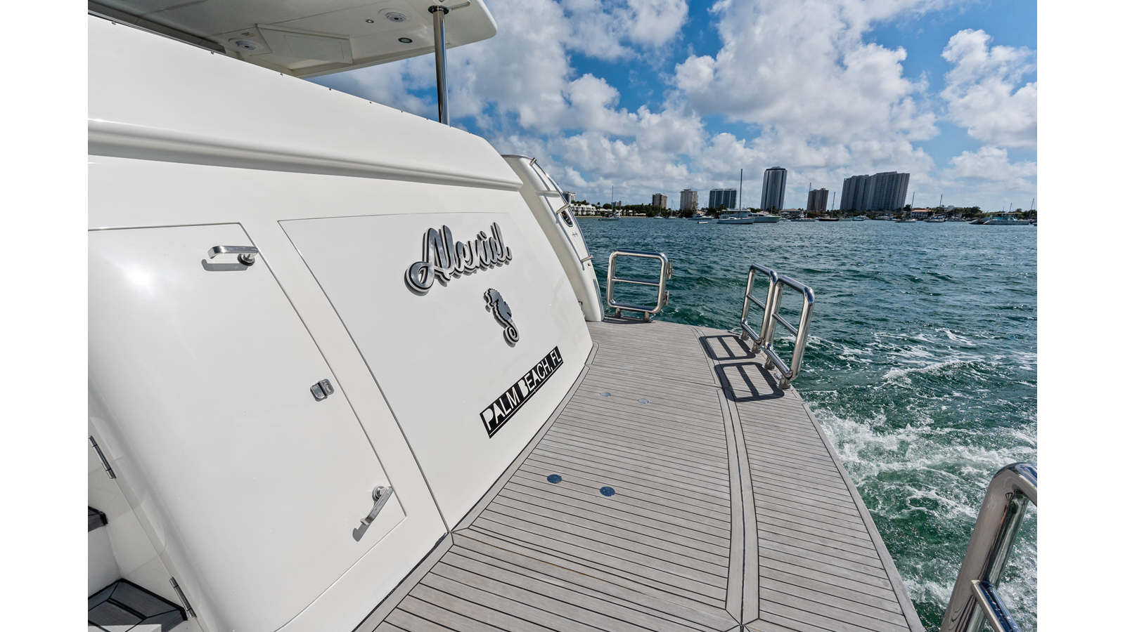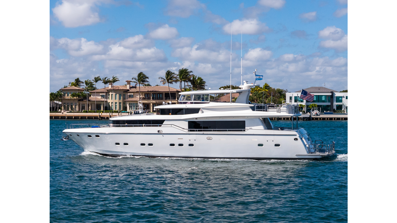 The unmistakable lines of the Bill Dixon design, with upper and lower vertical windows, make her profile iconic. This same yacht is still being built today, now marketed as a 93 with an extended platform.