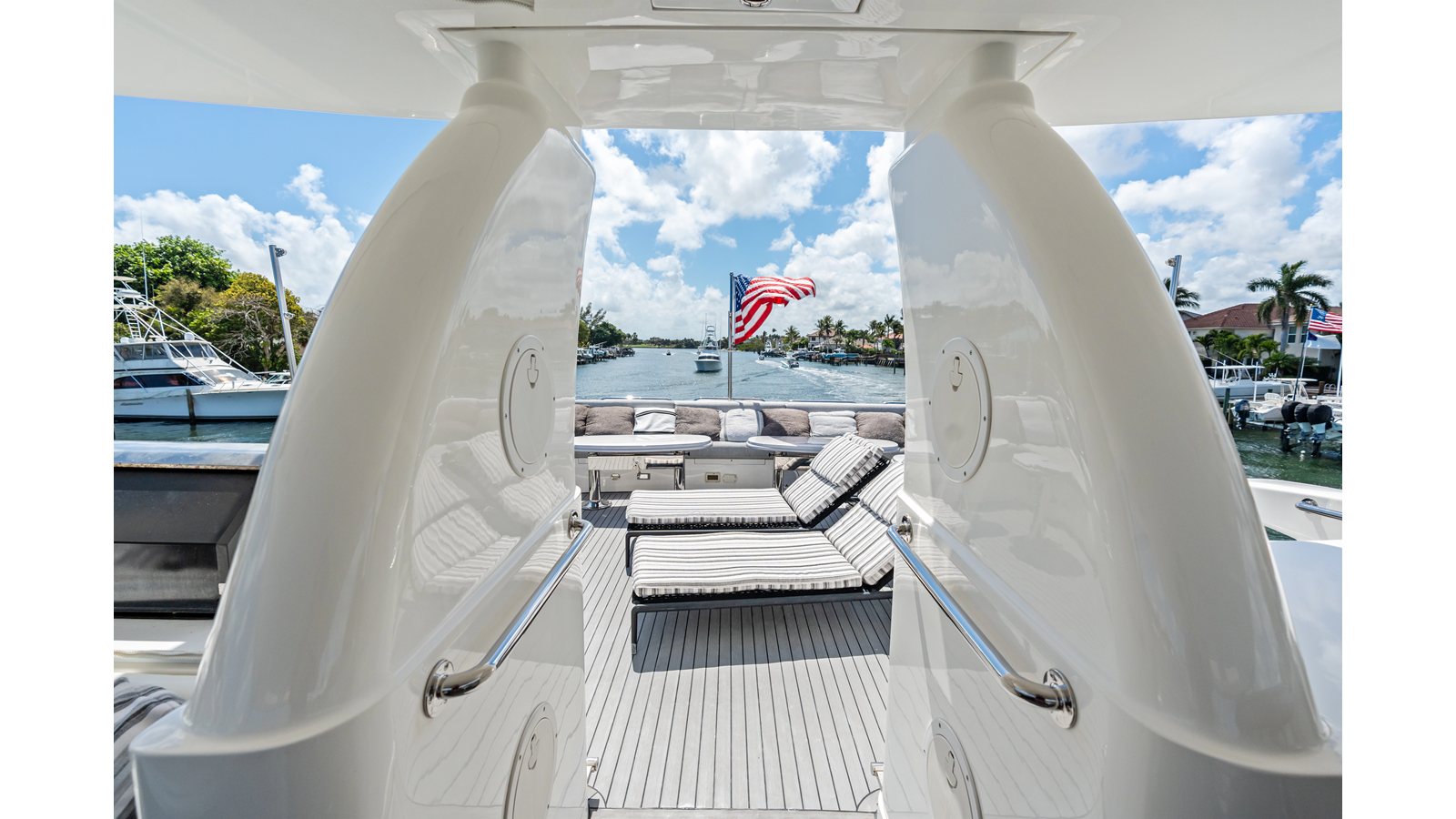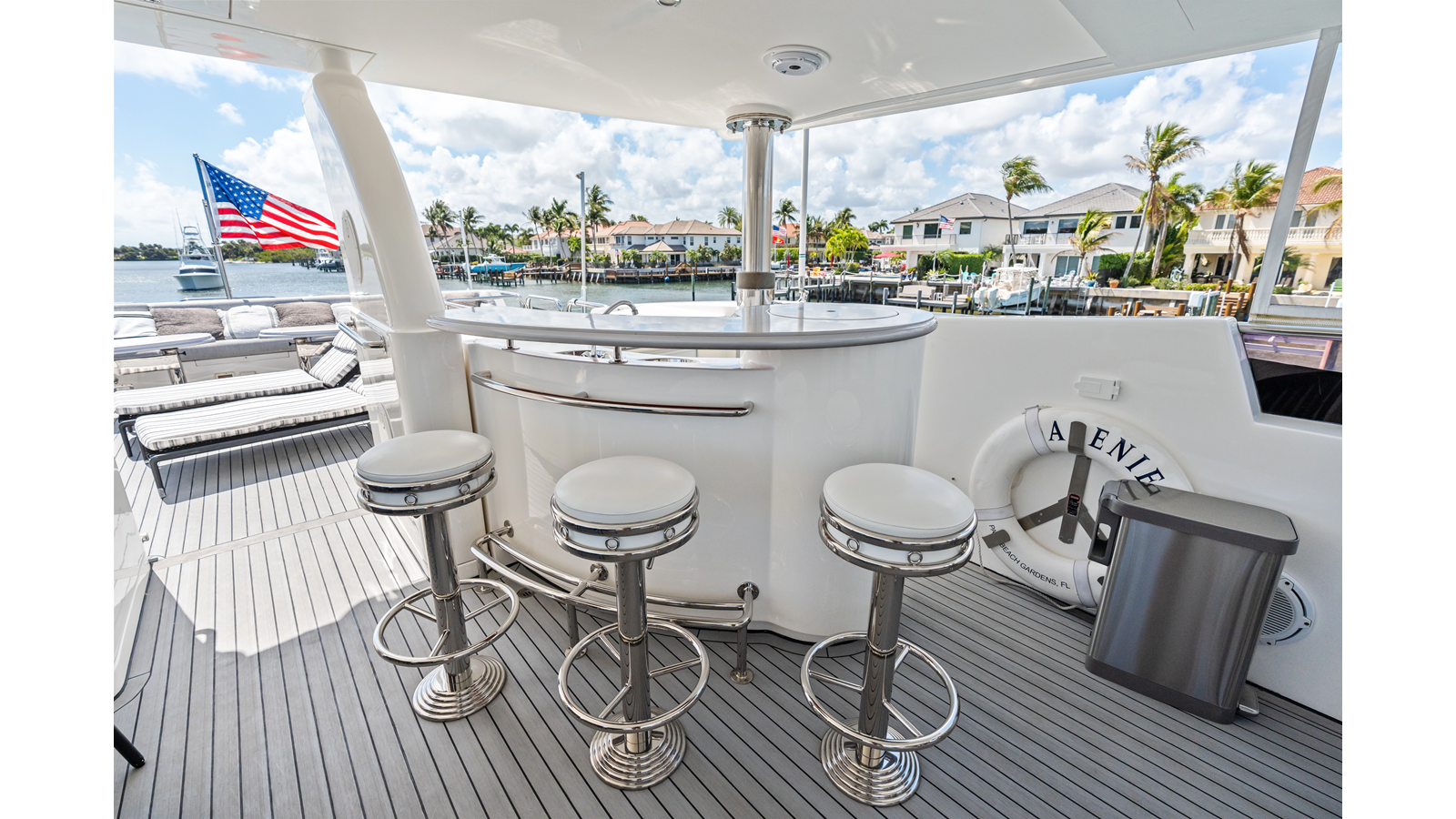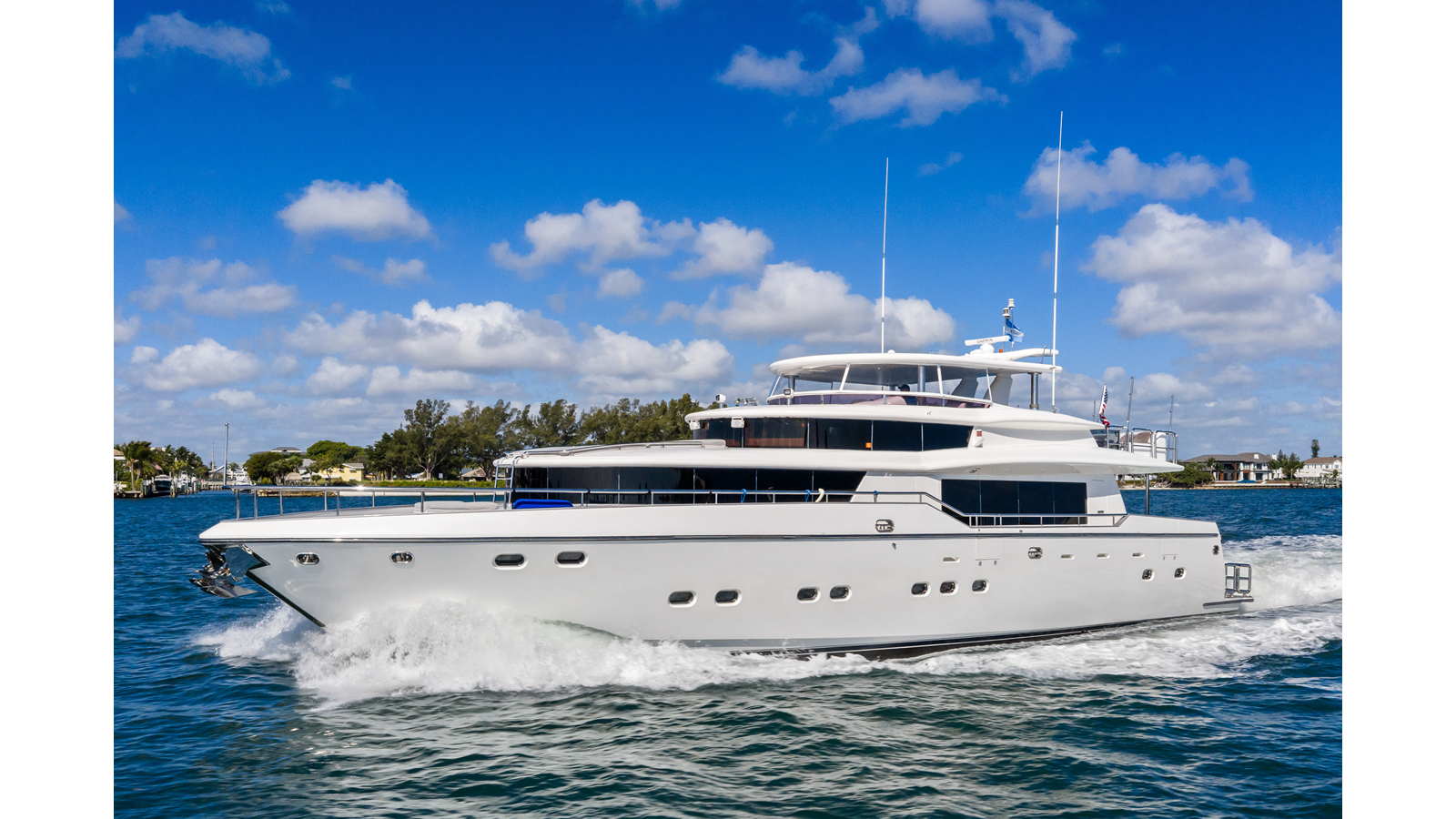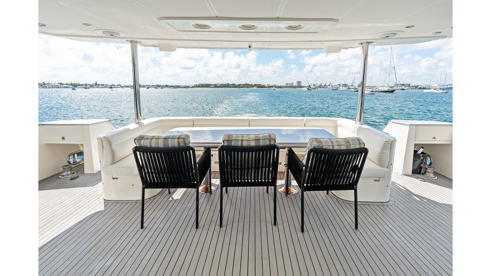 The unmistakable lines of the Bill Dixon design, with upper and lower vertical windows, make her profile iconic. This same yacht is still being built today, now marketed as a 93 with an extended platform.
