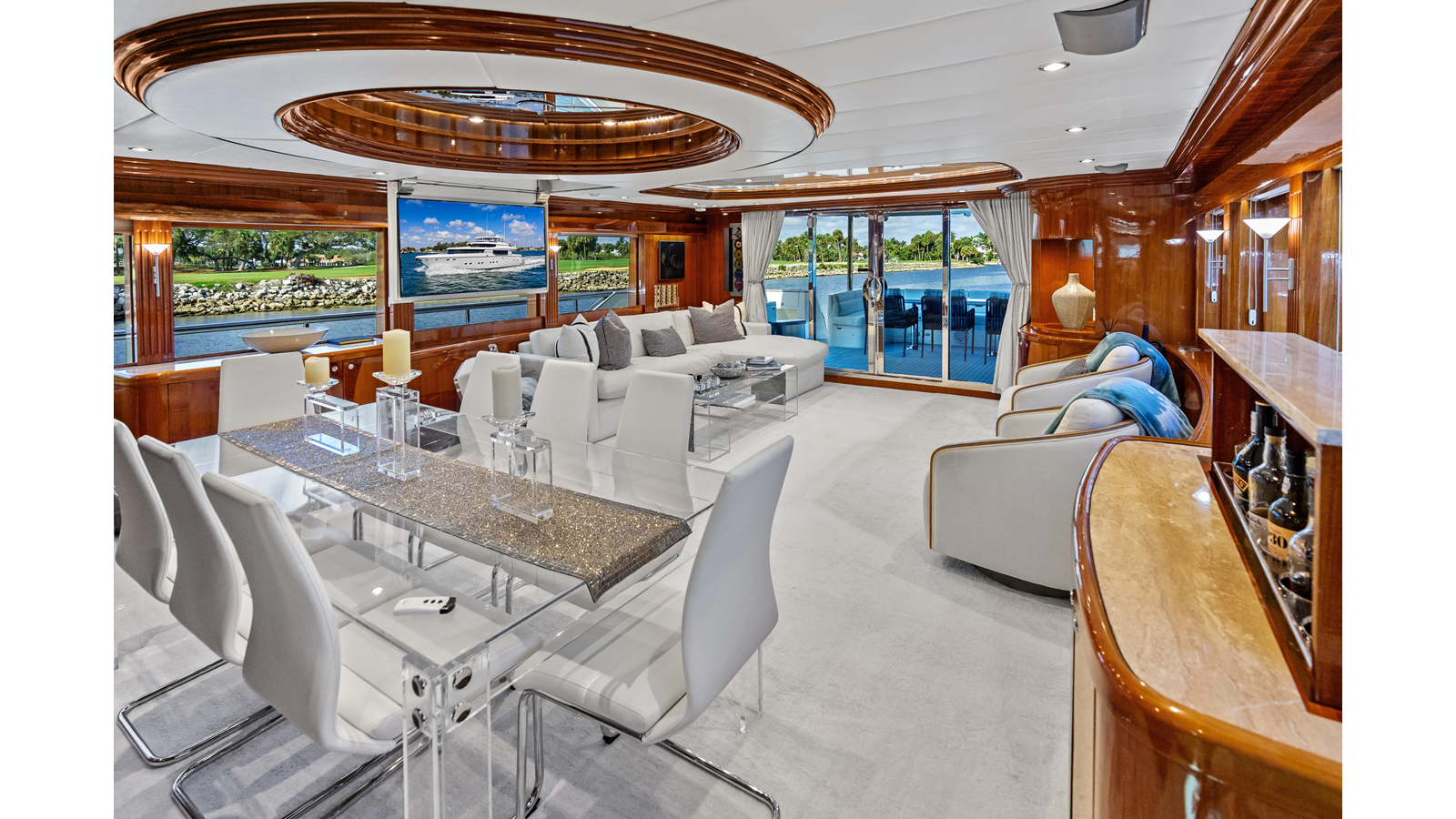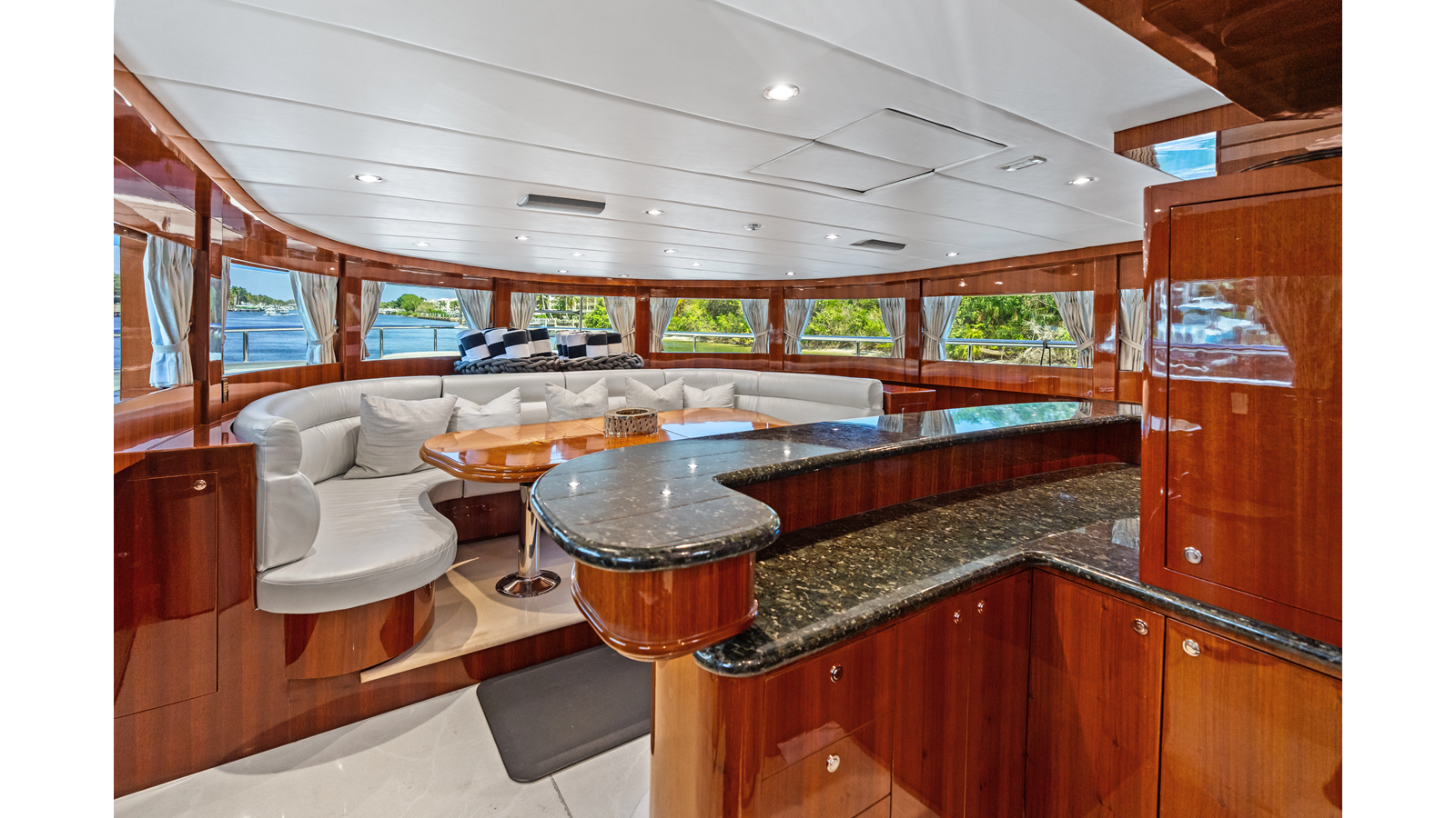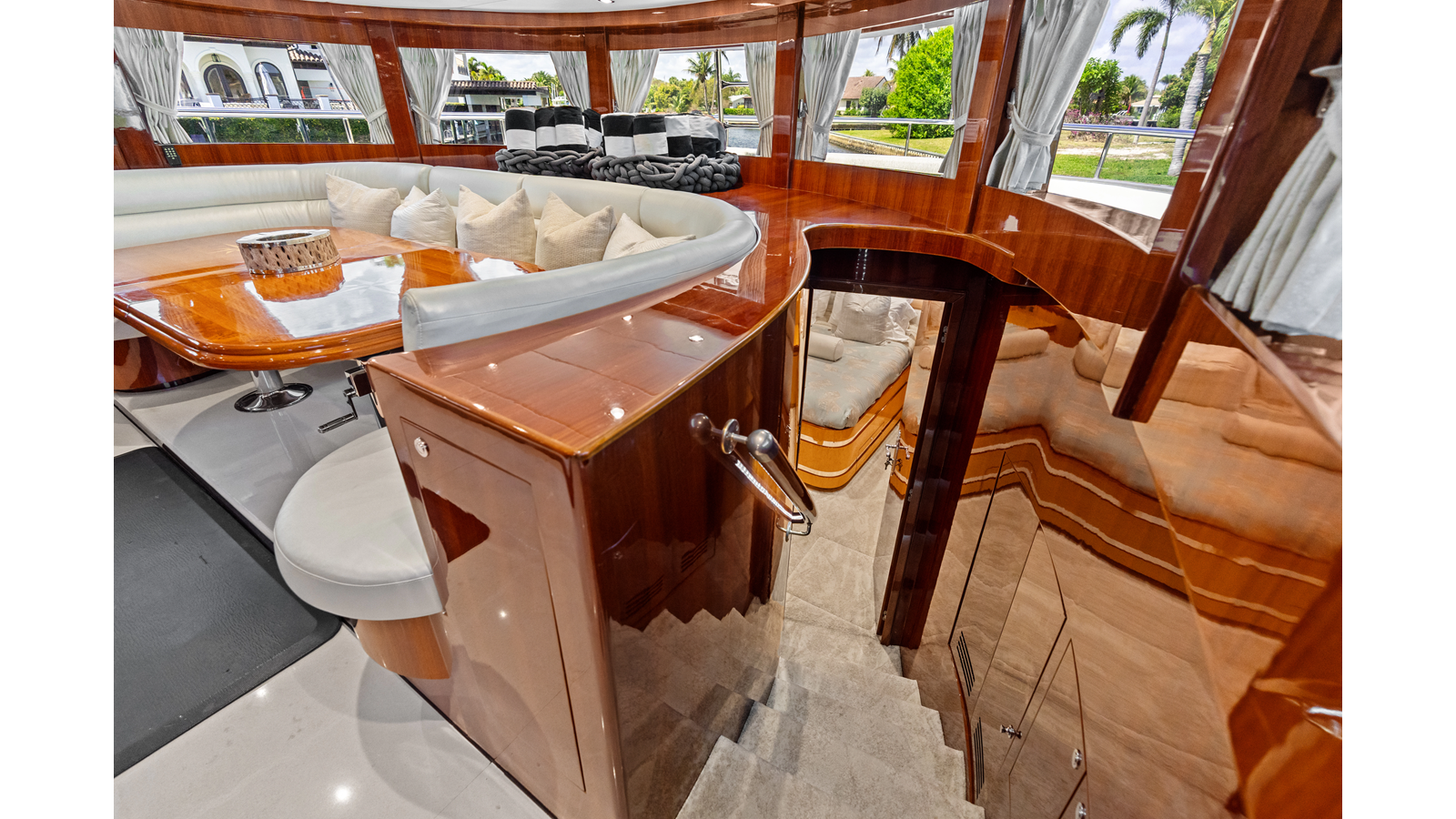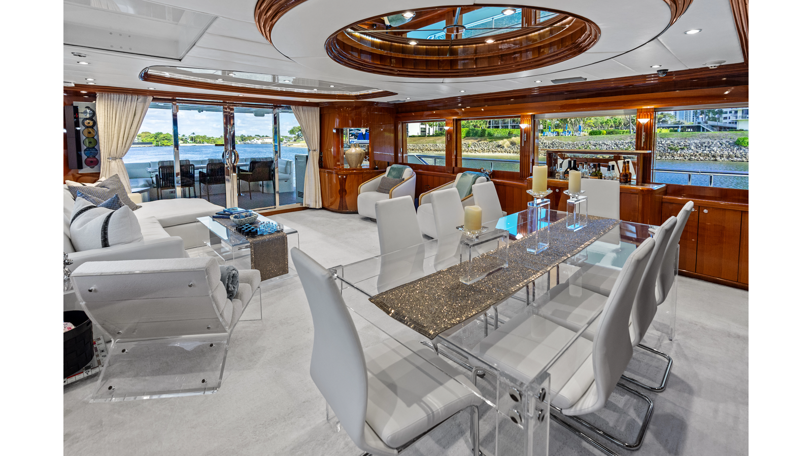 As you walk through the electric stainless doors, the interior volume truly stands out, thanks to her 23’6" beam. She has a substantially wider beam than most yachts in her class—just a few inches shy of a 112′ Westport—which sets this 87 Johnson apart from others in this size range.