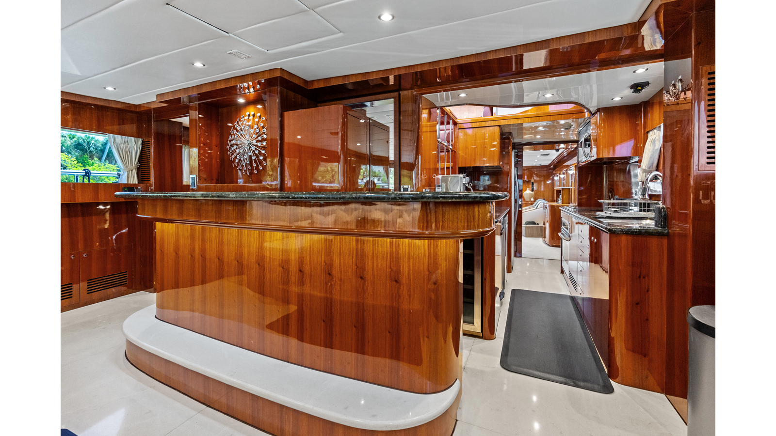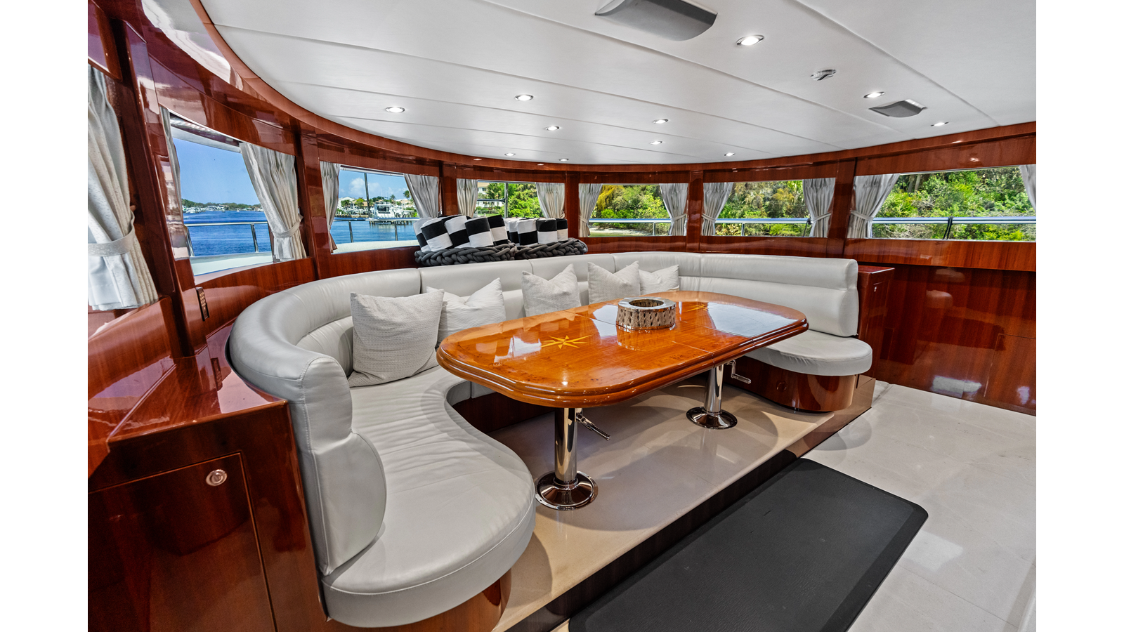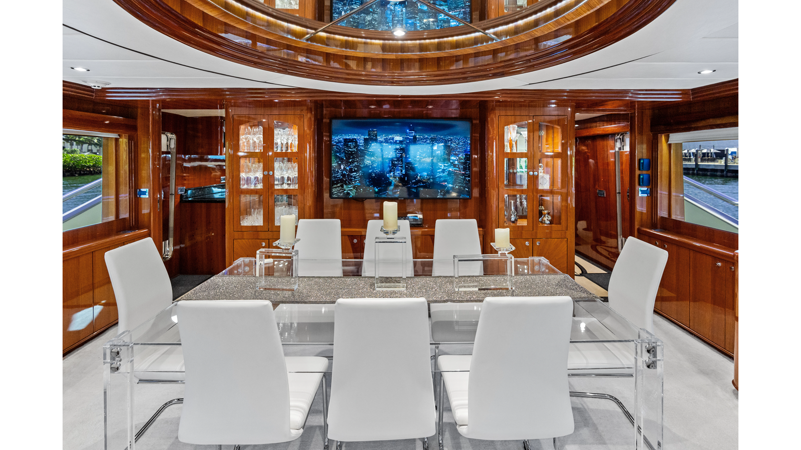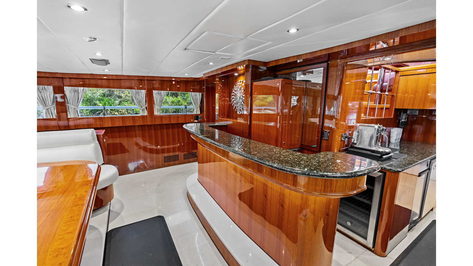 As you walk through the electric stainless doors, the interior volume truly stands out, thanks to her 23’6" beam. She has a substantially wider beam than most yachts in her class—just a few inches shy of a 112′ Westport—which sets this 87 Johnson apart from others in this size range.