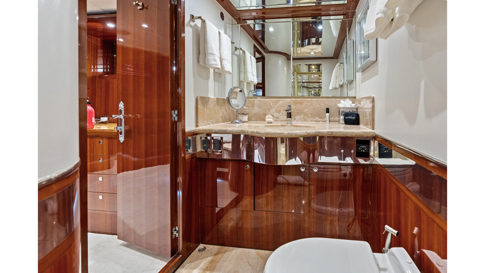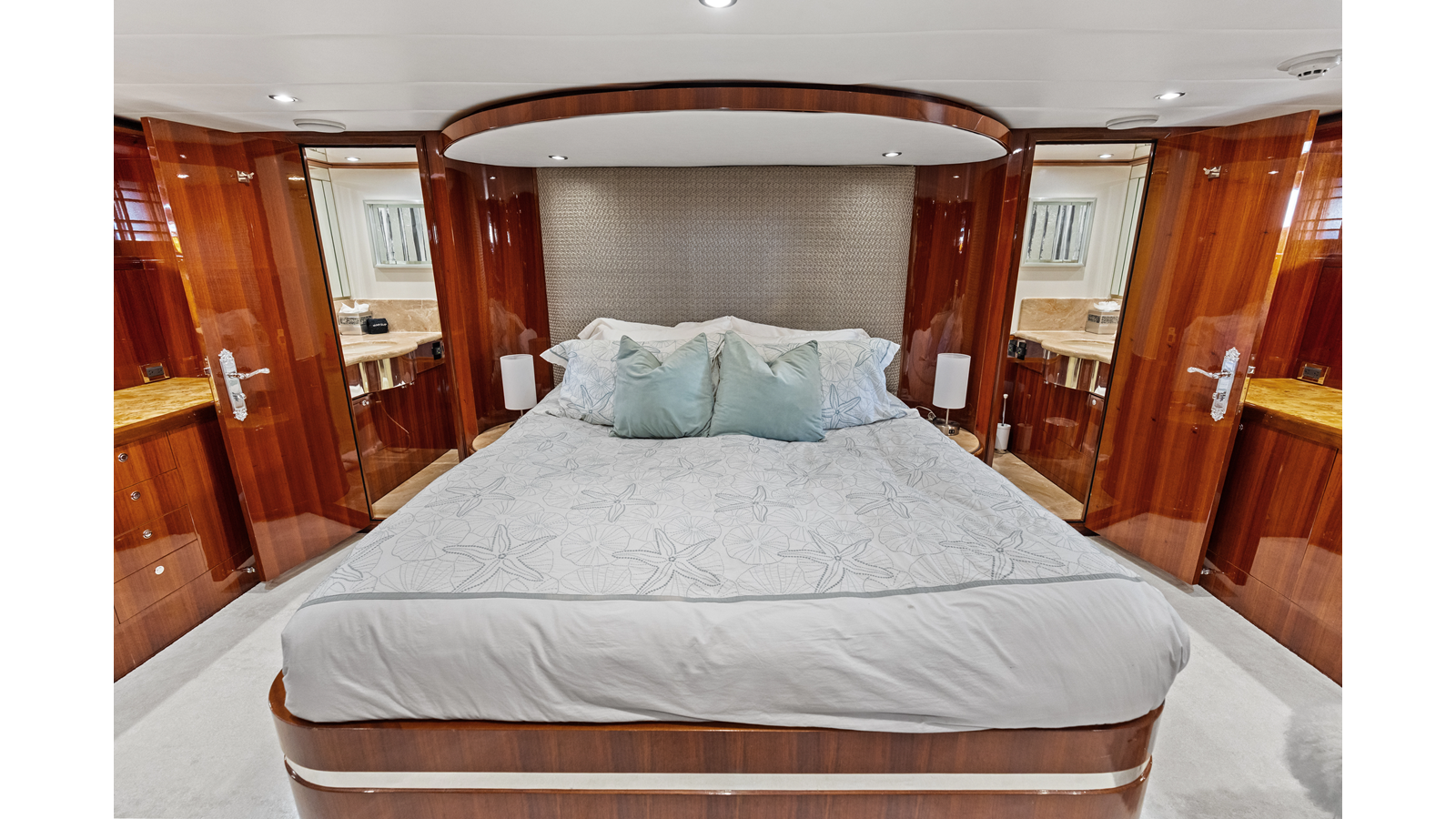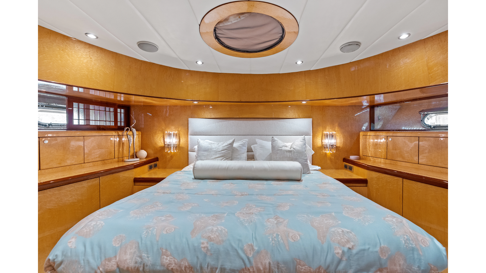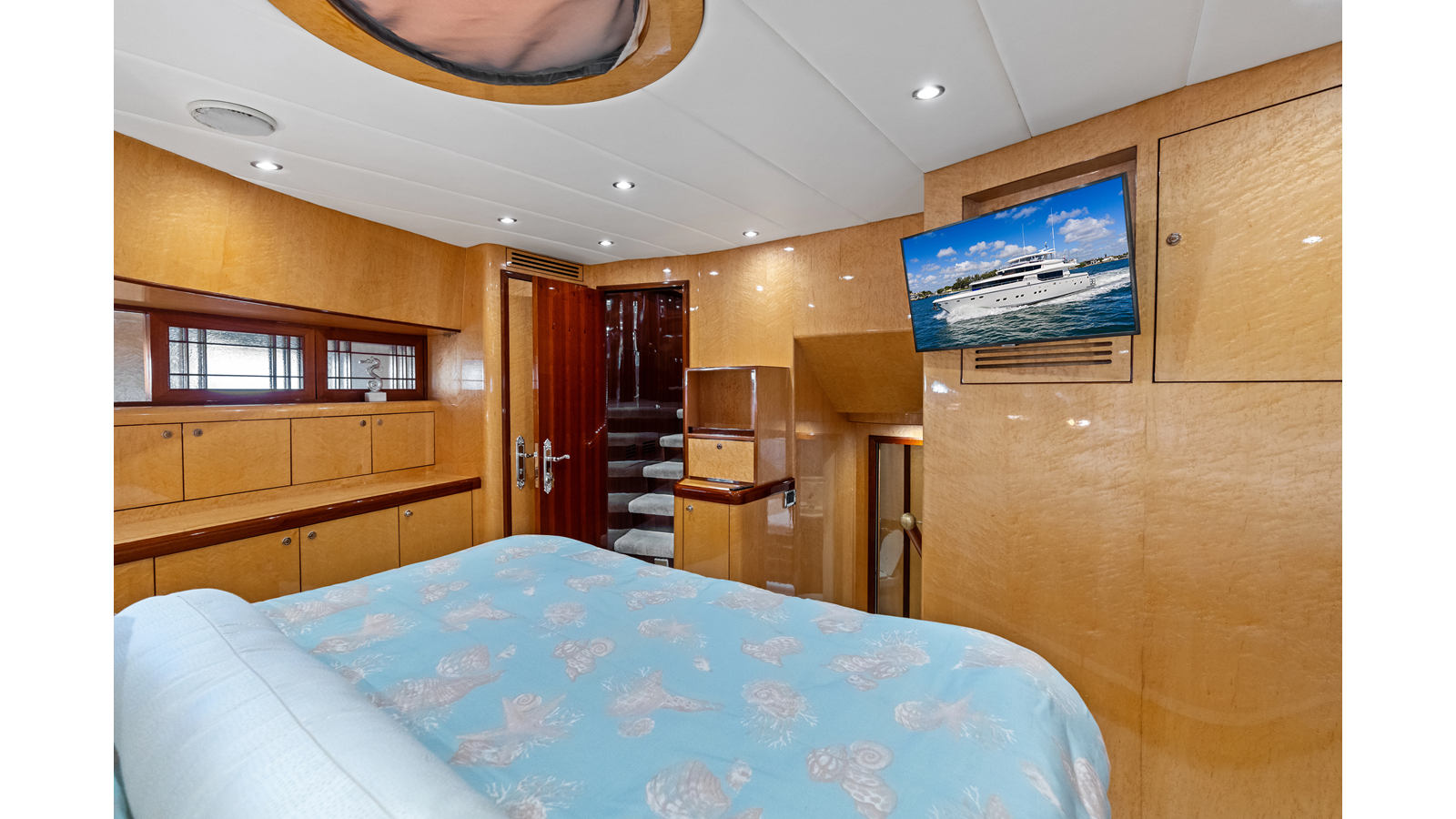As you walk through the electric stainless doors, the interior volume truly stands out, thanks to her 23’6" beam. She has a substantially wider beam than most yachts in her class—just a few inches shy of a 112′ Westport—which sets this 87 Johnson apart from others in this size range.