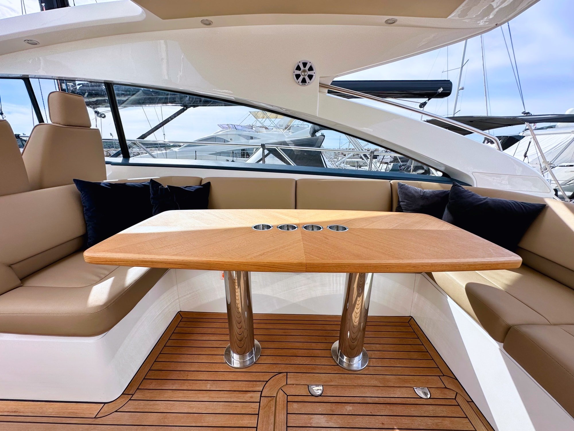 Este modelo es un exitoso ejemplo del estilo de vida de los yates de crucero abiertos, y realmente se tiene esa sensación de libertad y fácil manejo cuando se navega a 28 nudos con el techo abierto y la brisa veraniega despeinando el cabello.