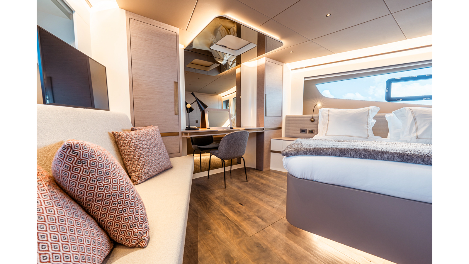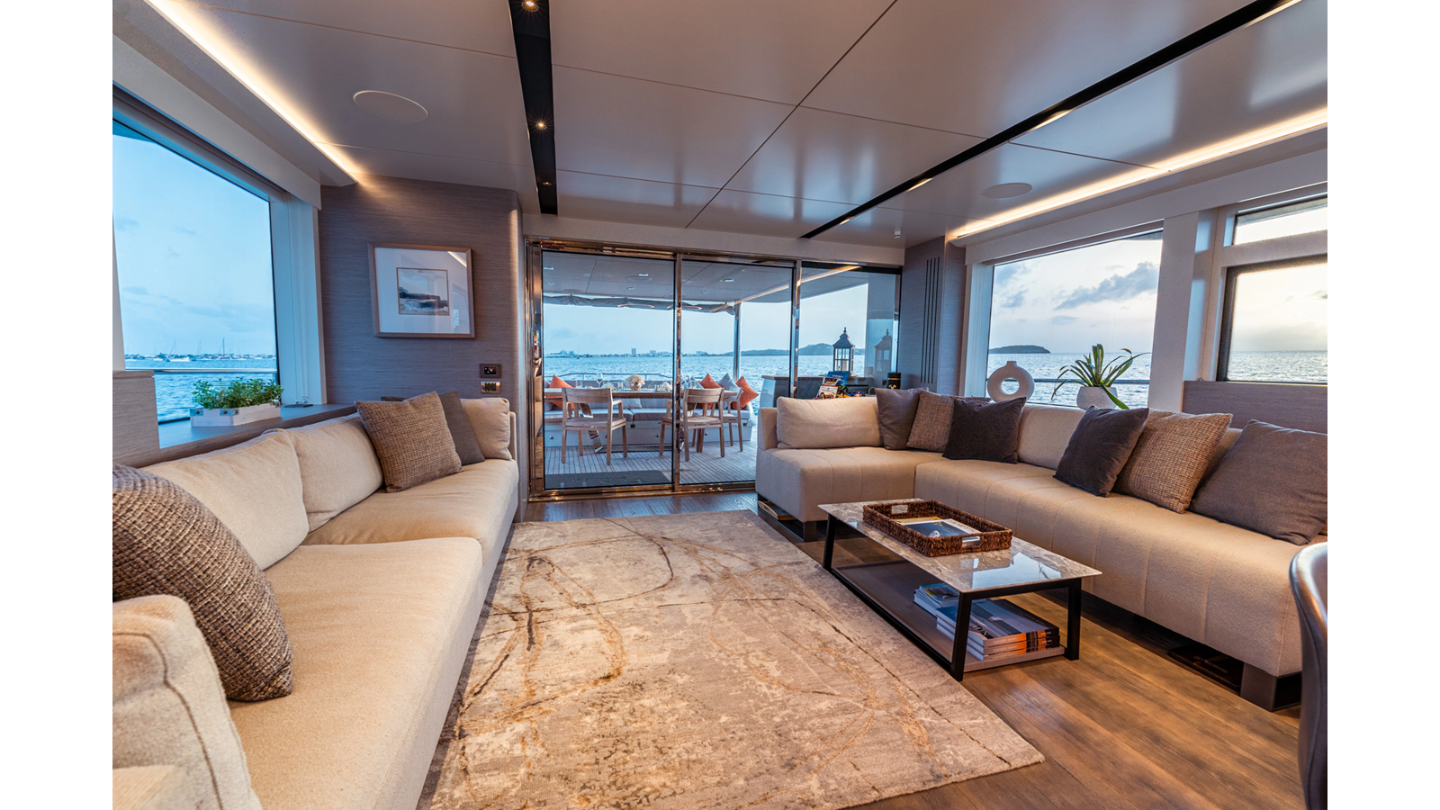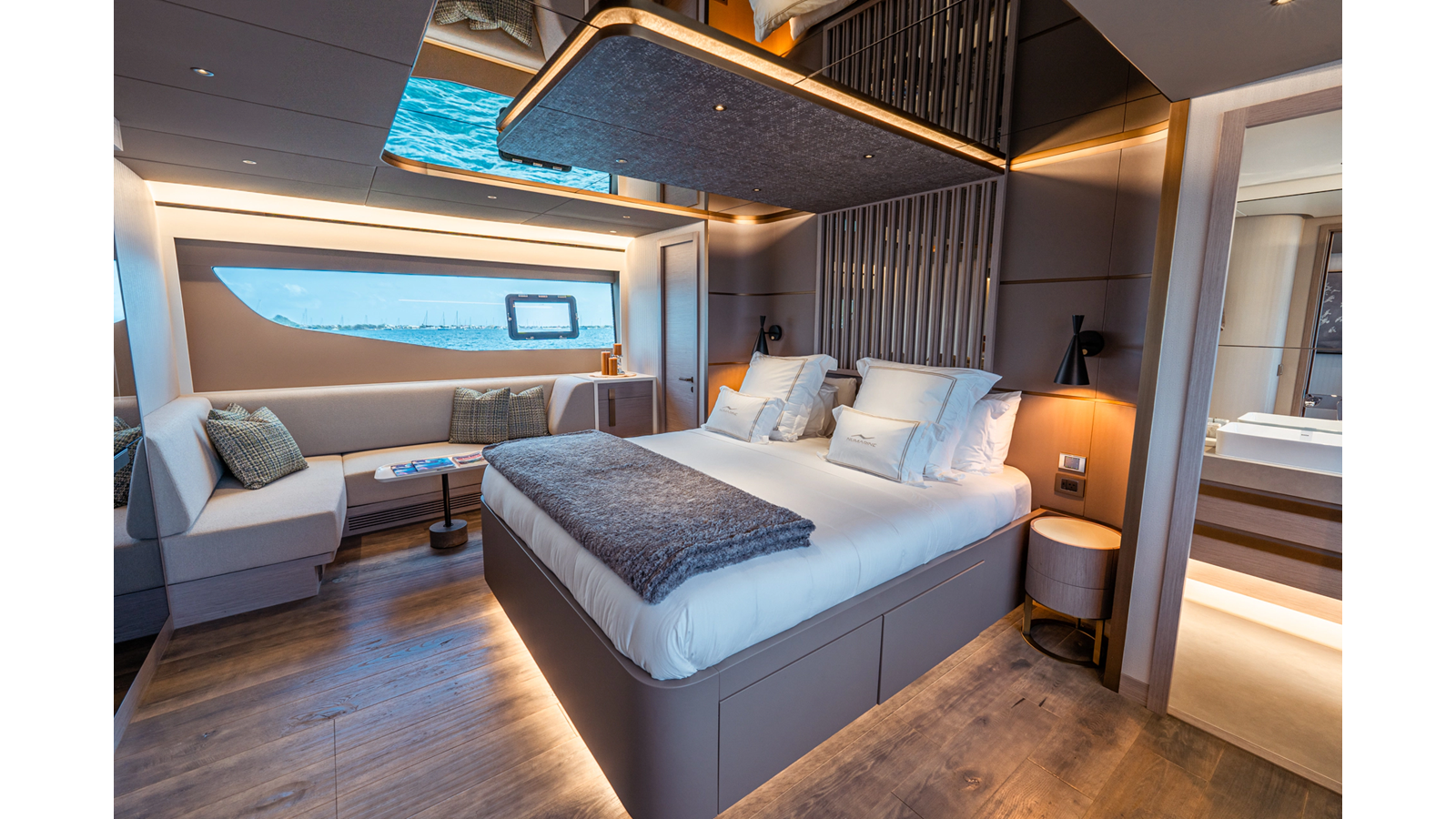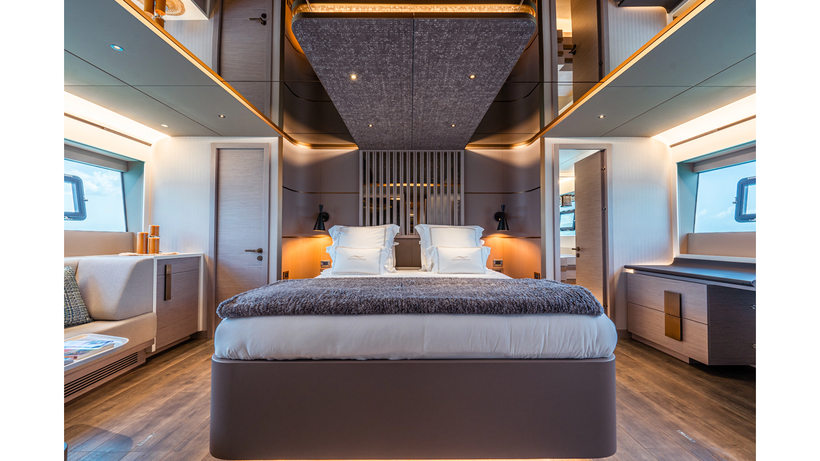 Onboard comfort is further enhanced by the latest-generation electric fin stabilization system, providing exceptional stability both underway and at anchor. The extended flybridge hardtop is equipped with a comprehensive solar energy package and an impressive 80 kW lithium-ion battery bank, forming the Silent Package that allows for silent overnight operation without generator use.