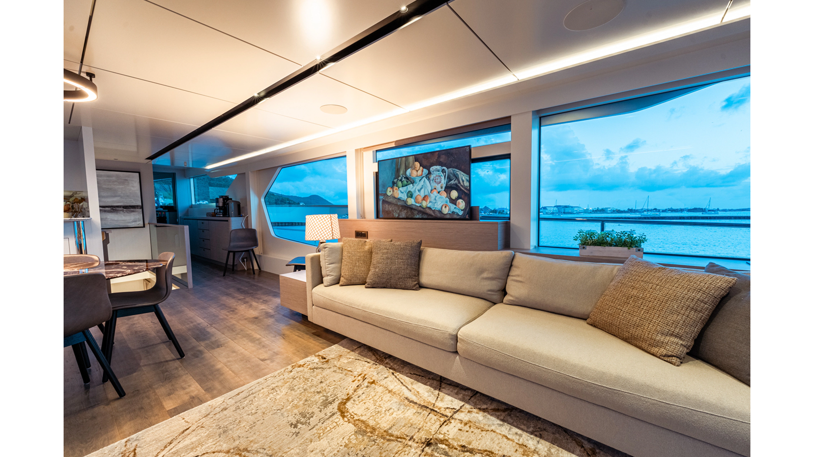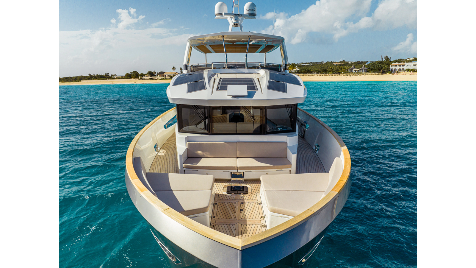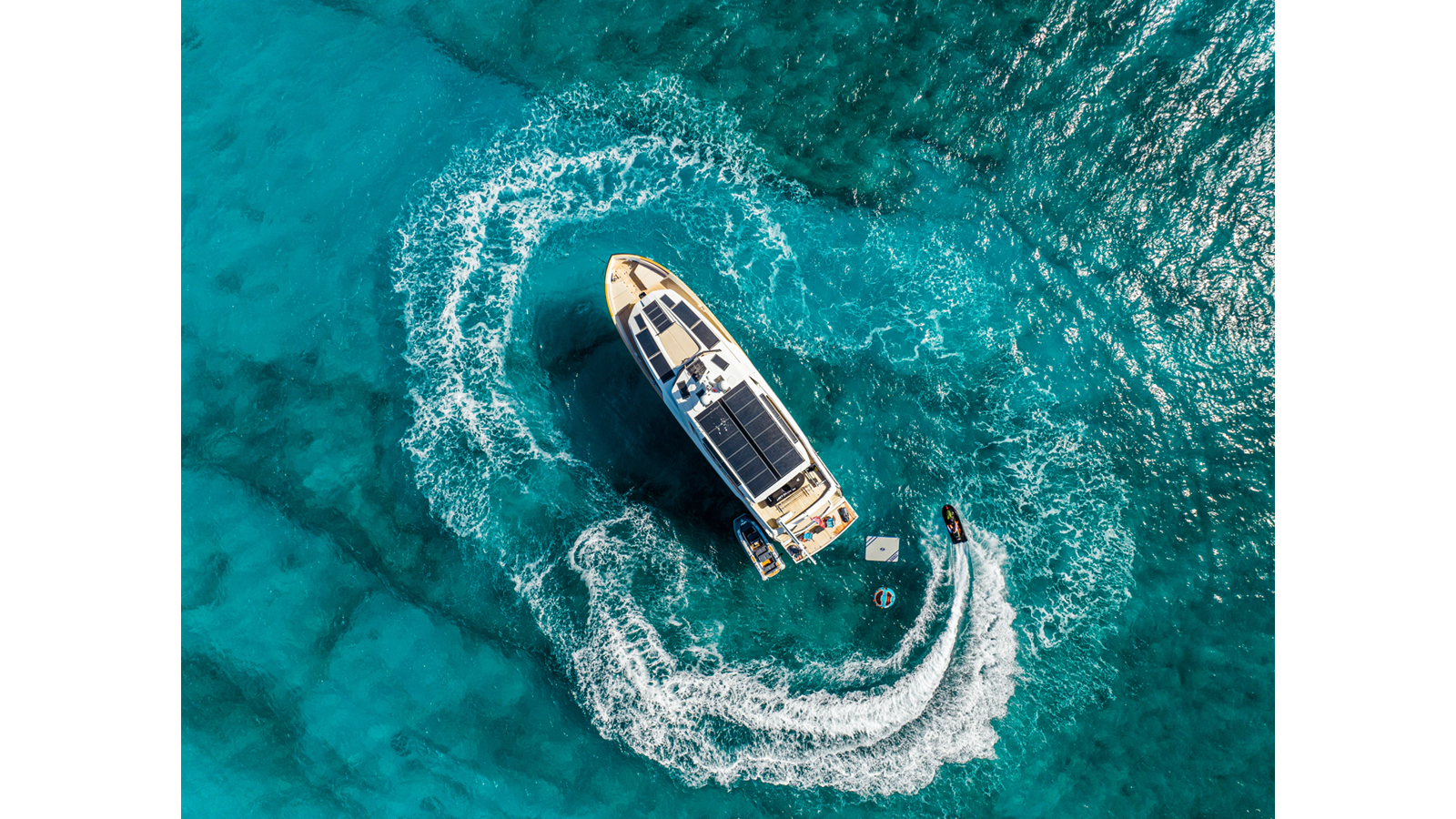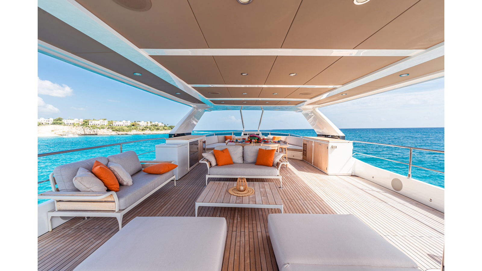 Onboard comfort is further enhanced by the latest-generation electric fin stabilization system, providing exceptional stability both underway and at anchor. The extended flybridge hardtop is equipped with a comprehensive solar energy package and an impressive 80 kW lithium-ion battery bank, forming the Silent Package that allows for silent overnight operation without generator use.