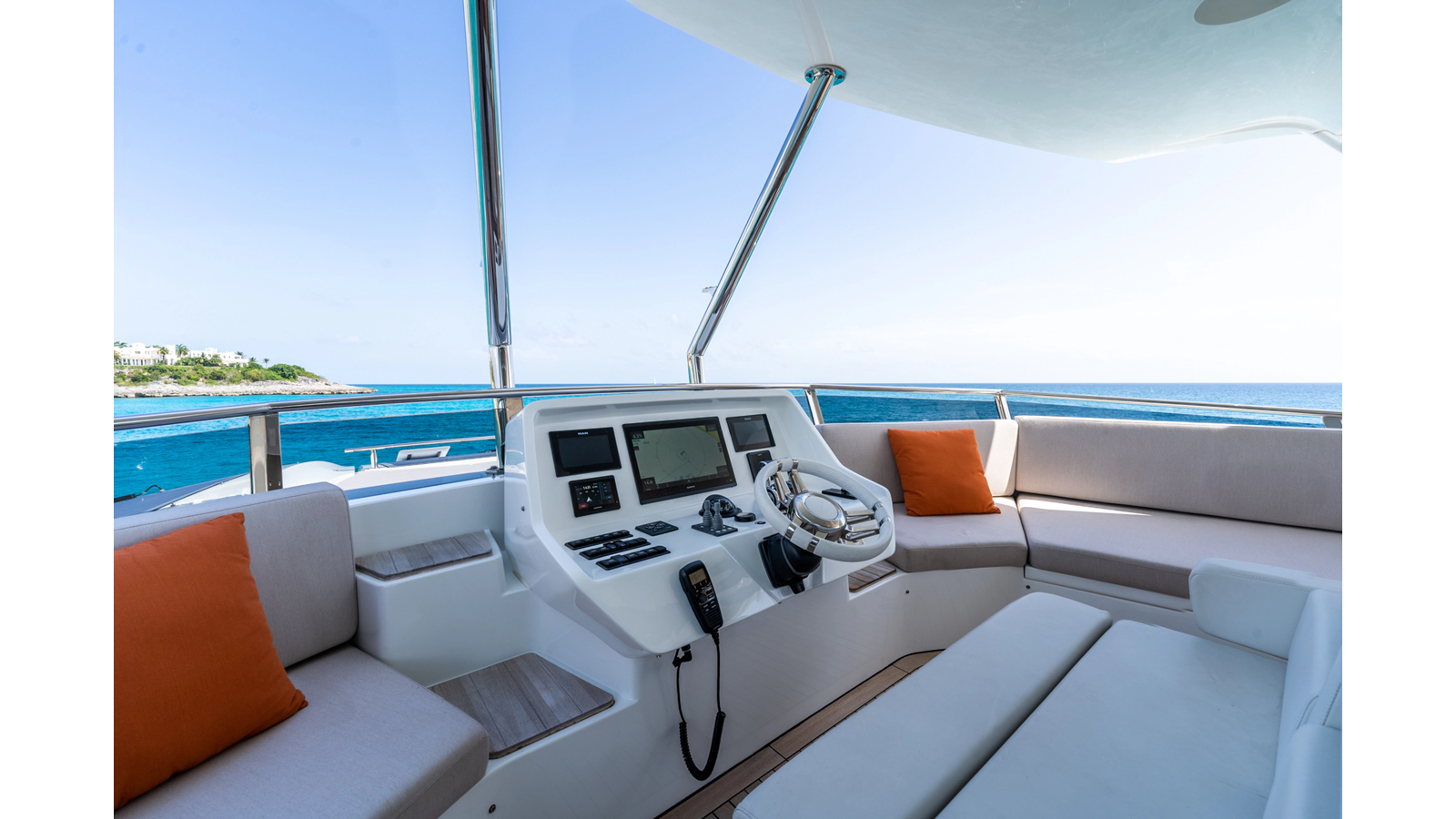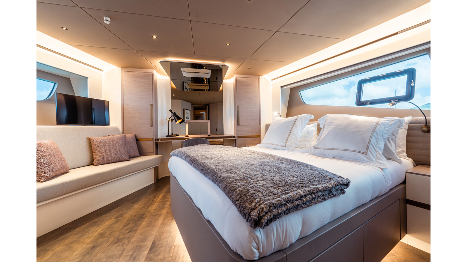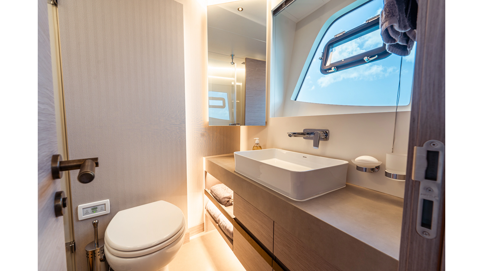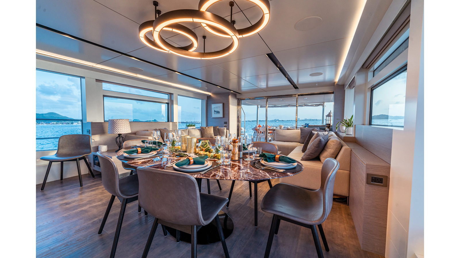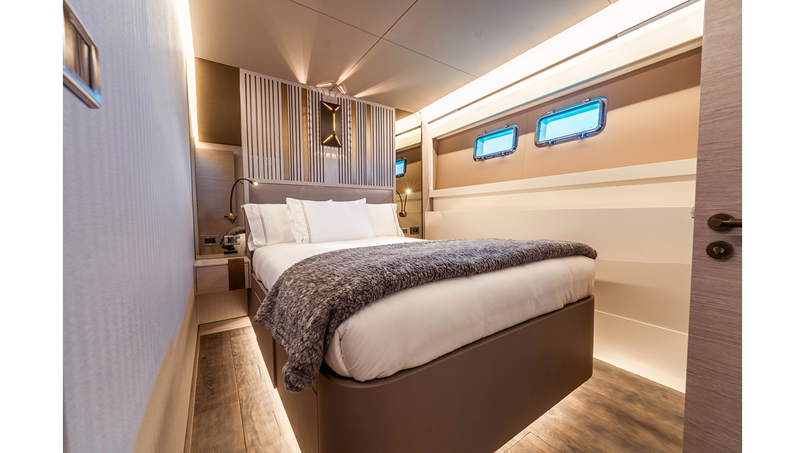 Onboard comfort is further enhanced by the latest-generation electric fin stabilization system, providing exceptional stability both underway and at anchor. The extended flybridge hardtop is equipped with a comprehensive solar energy package and an impressive 80 kW lithium-ion battery bank, forming the Silent Package that allows for silent overnight operation without generator use.