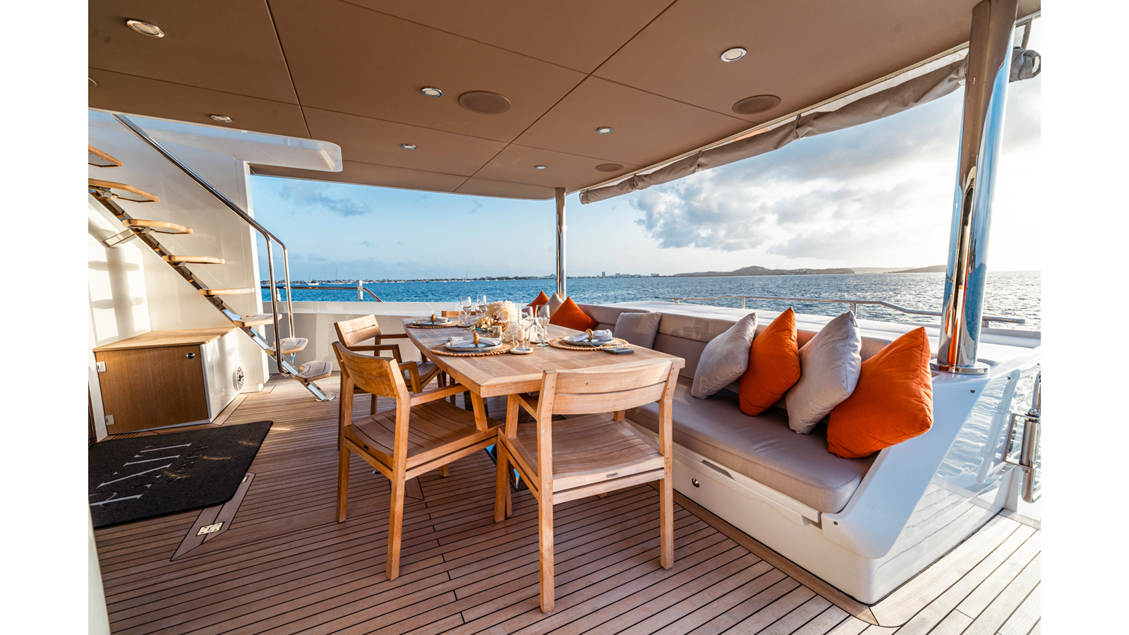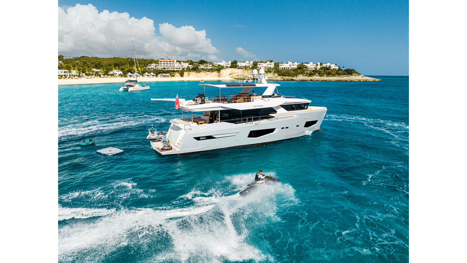 Constructed in advanced composite FRP, she is engineered with Silent Line noise and vibration control package, delivering performance that meets and exceeds “Comfort Class” standards. As a result, EXIT STRATEGY distinguishes herself as one of the quietest yachts in her CE category, while her CE Class A offshore certification ensures true blue water cruising capability.