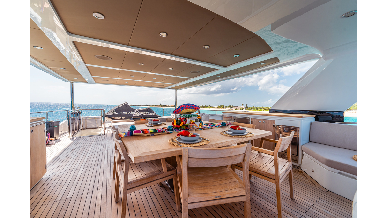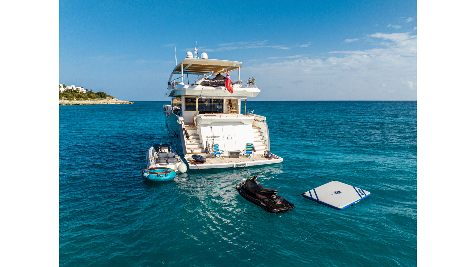 Additional highlights include a full beam midship master stateroom, a conveniently located day head in the passageway to the helm, hydraulic swim platform with lifting capacity for tender or toy storage, and a 900lb davit on the flybridge deck for jet skis, together creating a highly capable, efficient, and exceptionally comfortable long-range cruising yacht.