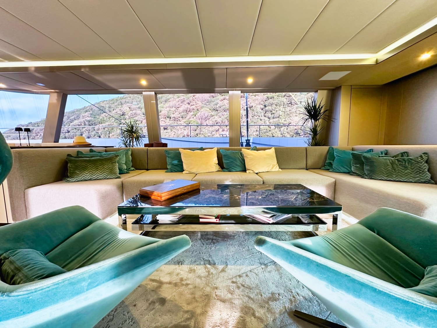 Verso poppa, la porta scorrevole si apre sul pozzetto, offrendo uno spazio per pranzare, un’area prendisole circondata da alberi di kumquat, un wet bar e anche un enorme e comodo lettino che ti permette di dormire o di goderti il panorama, il tutto comodamente seduto in una nicchia all’ombra, ben protetto dal sole, sempre con una brezza d’aria.