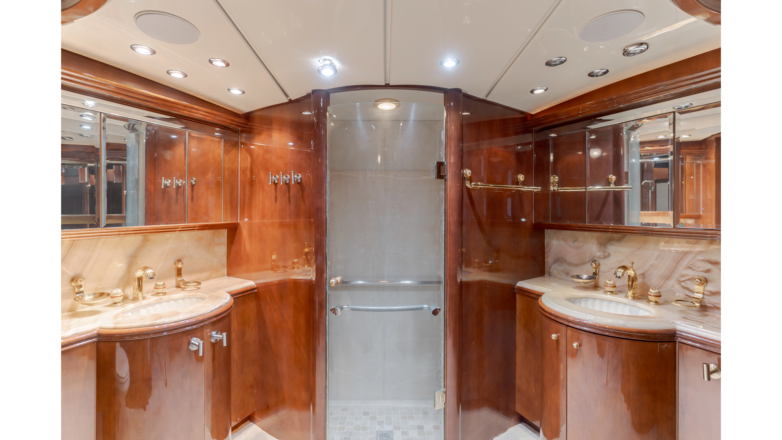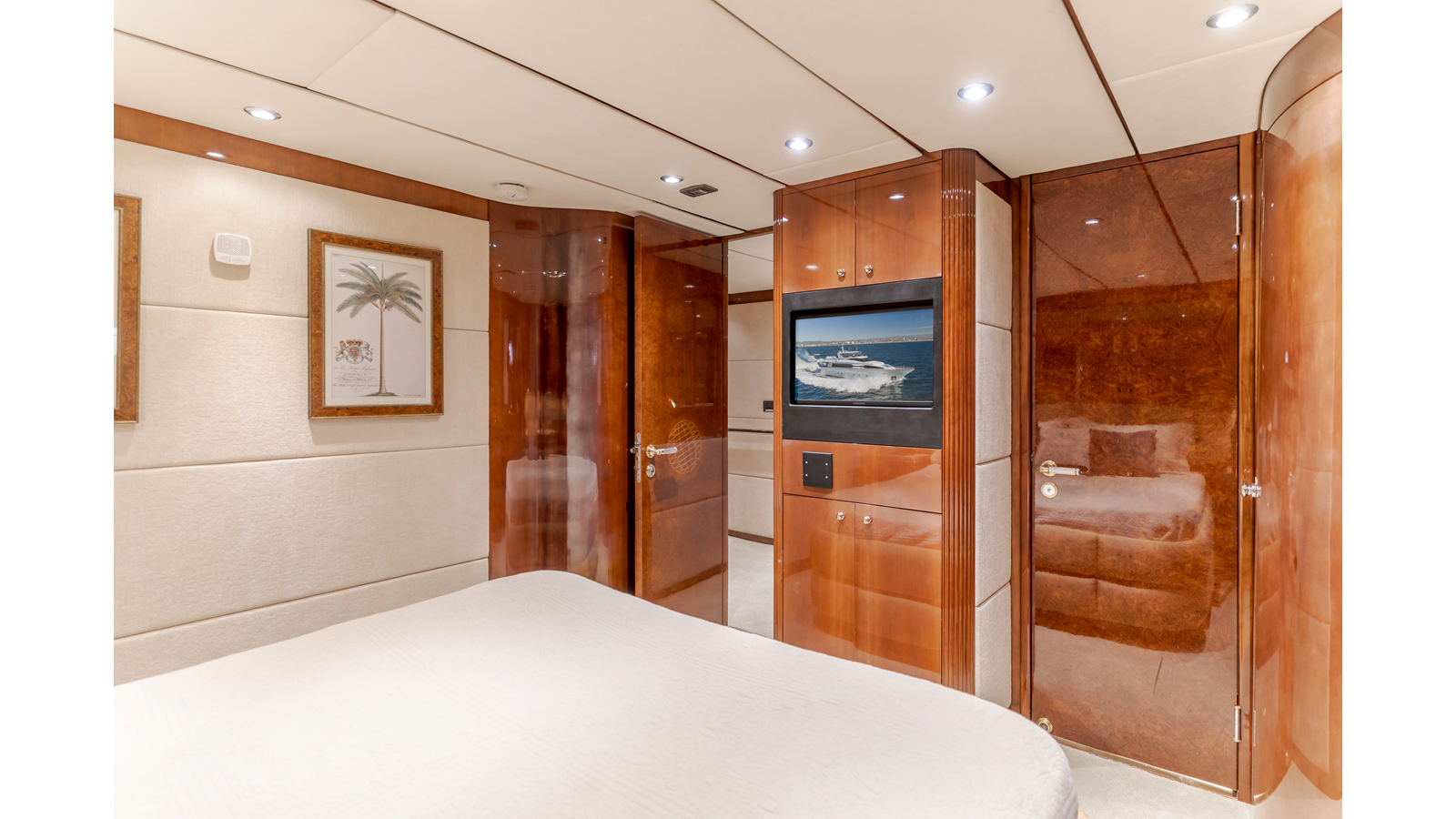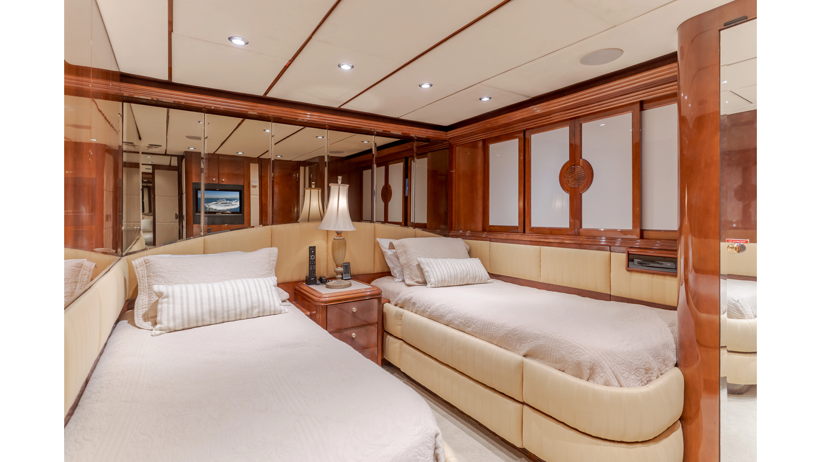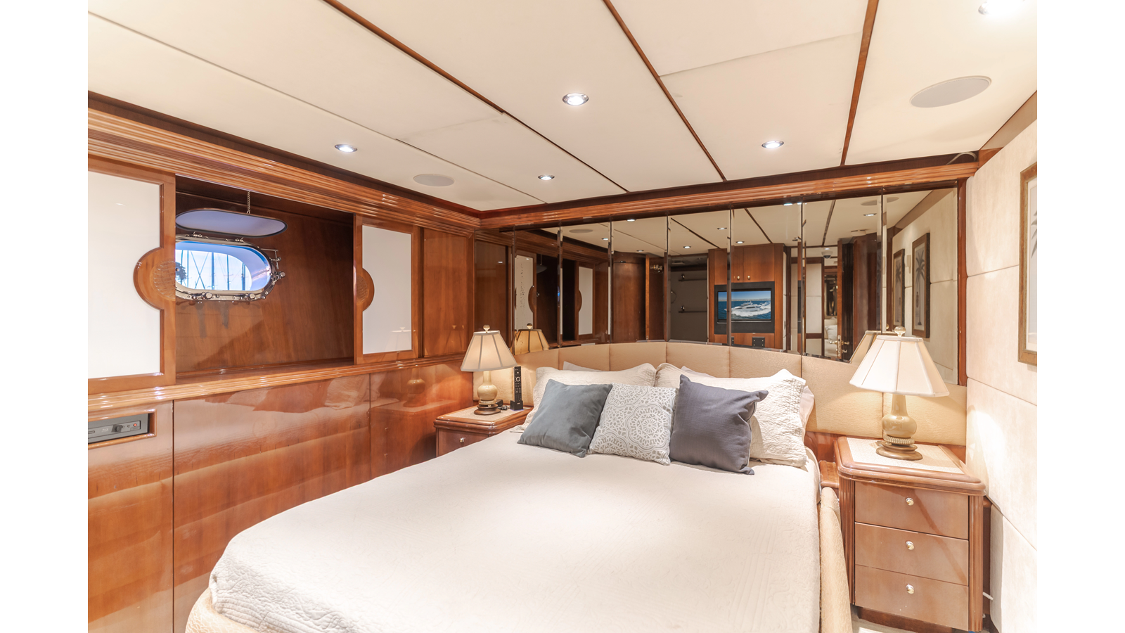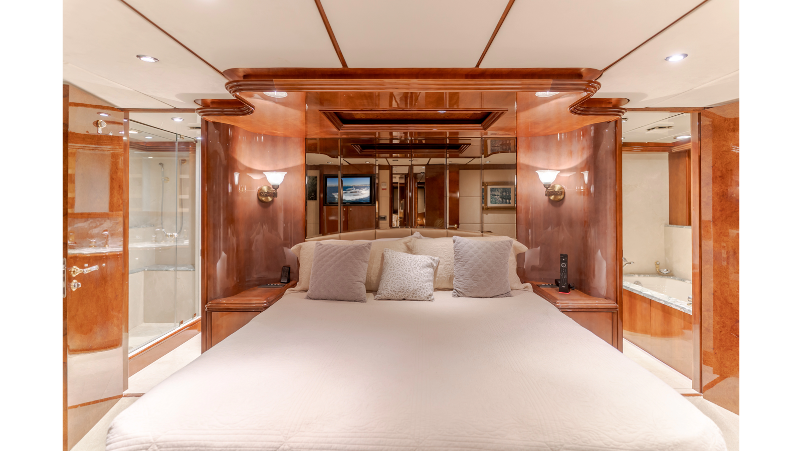 Accommodations for up to eight guests include four beautifully appointed staterooms. The full-beam, bi-level master suite on the main deck provides exceptional privacy, complemented by a second impressive full-beam master on the lower deck with his-and-hers baths. Two additional guest staterooms (one double, one twin) each feature en-suite bathrooms.