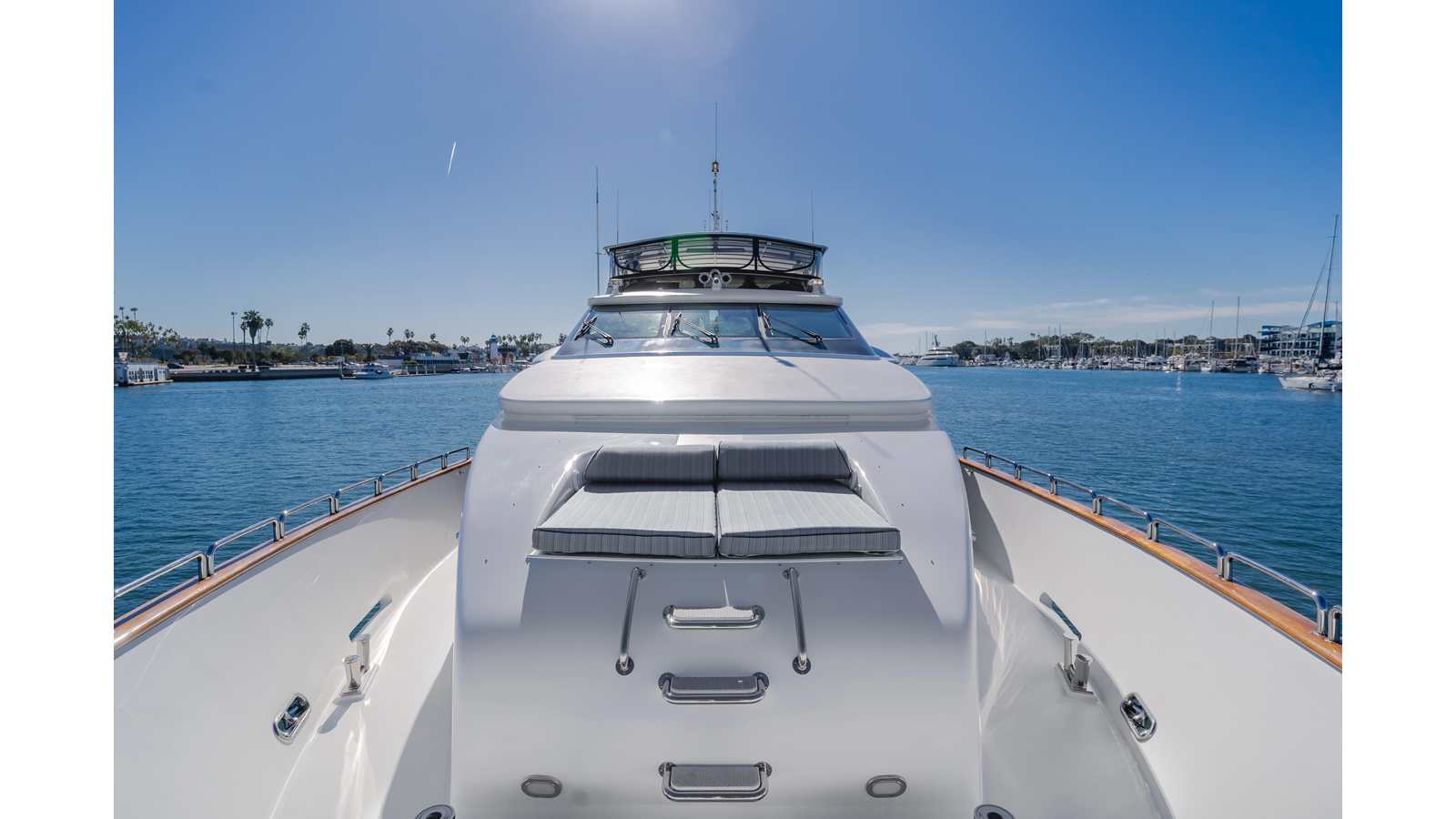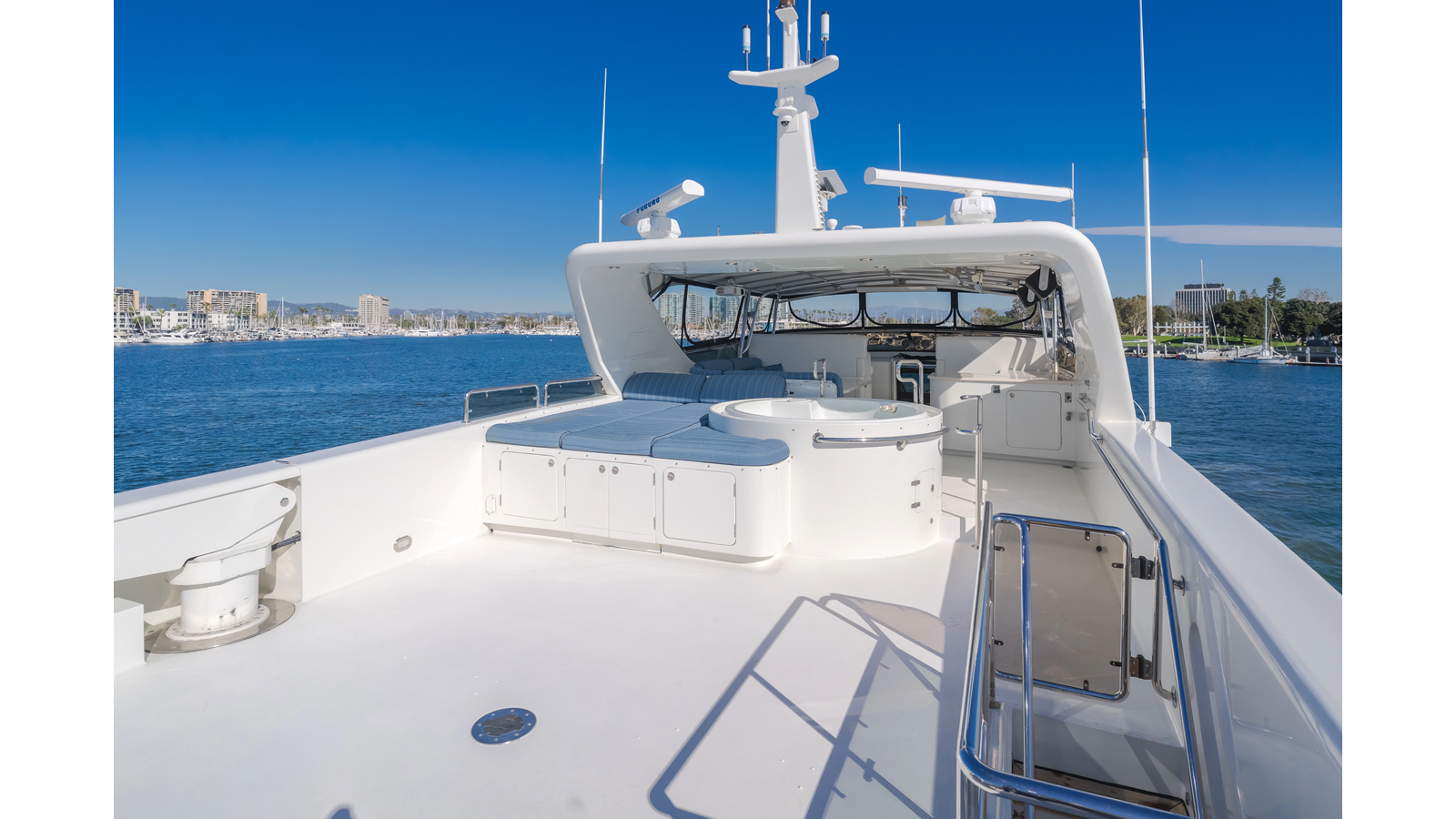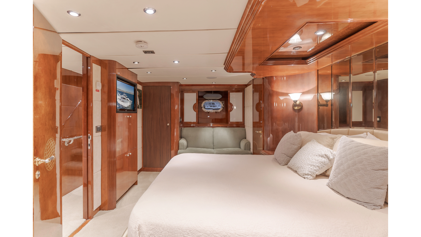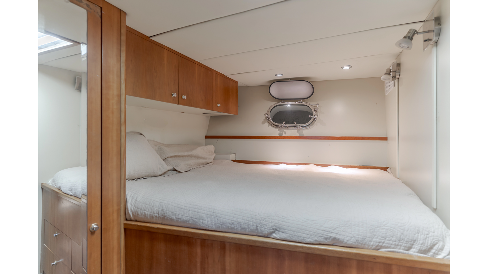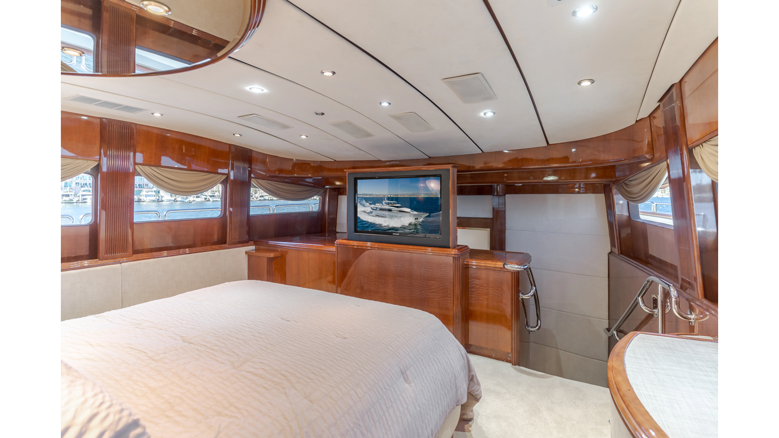Accommodations for up to eight guests include four beautifully appointed staterooms. The full-beam, bi-level master suite on the main deck provides exceptional privacy, complemented by a second impressive full-beam master on the lower deck with his-and-hers baths. Two additional guest staterooms (one double, one twin) each feature en-suite bathrooms.
