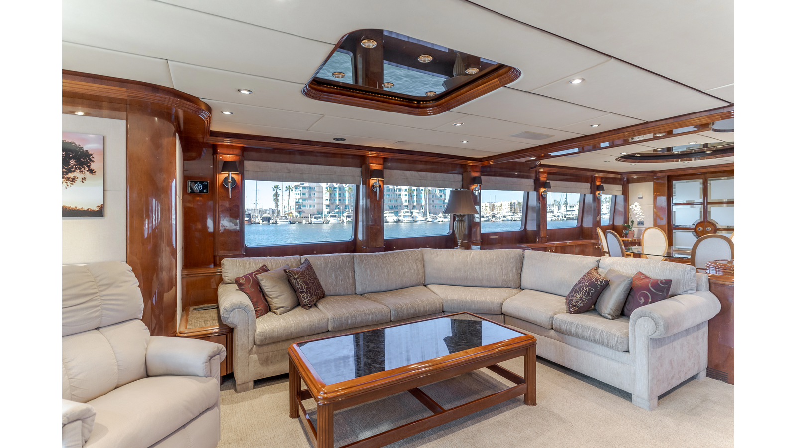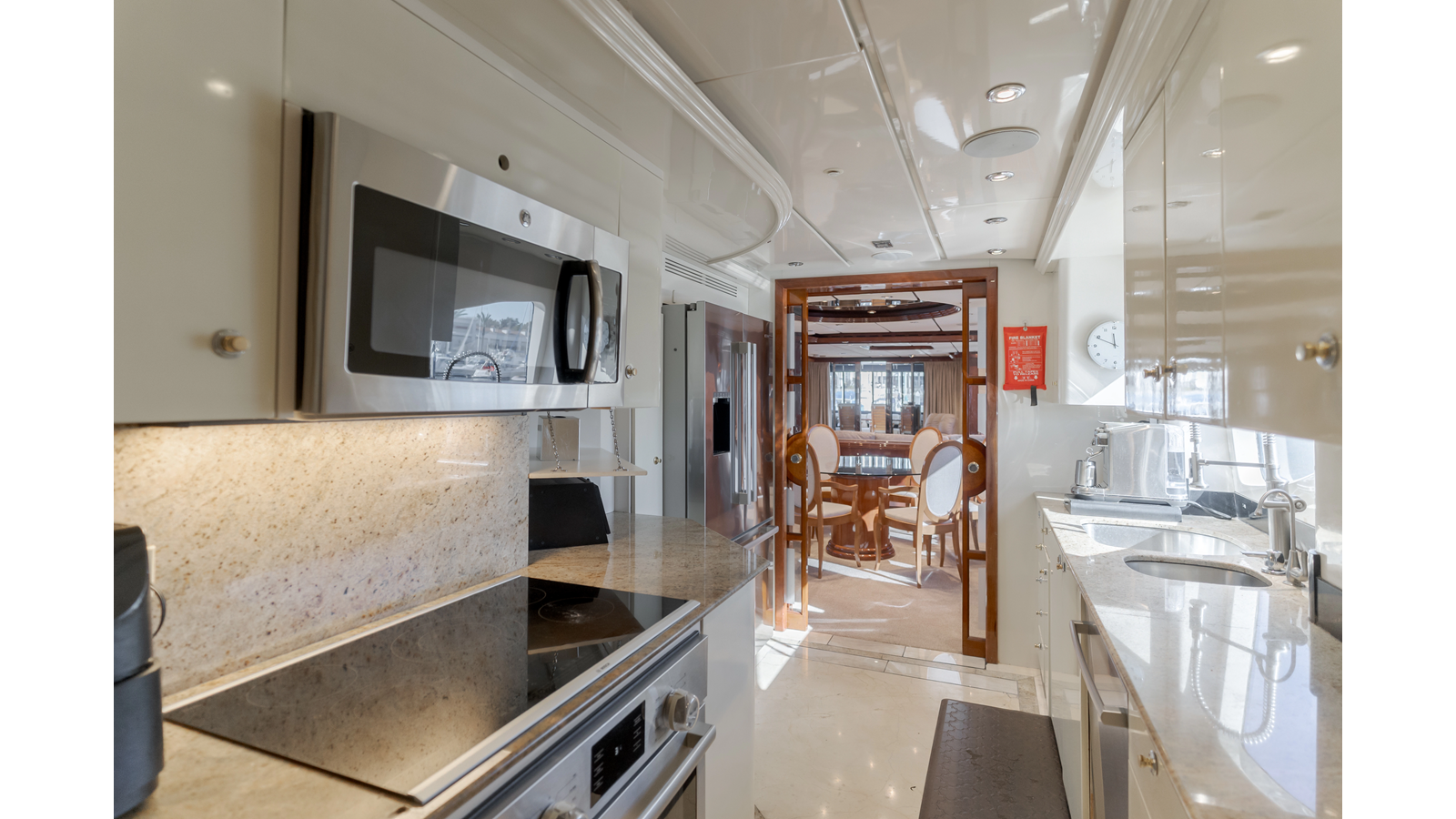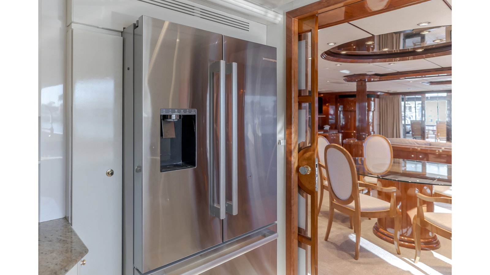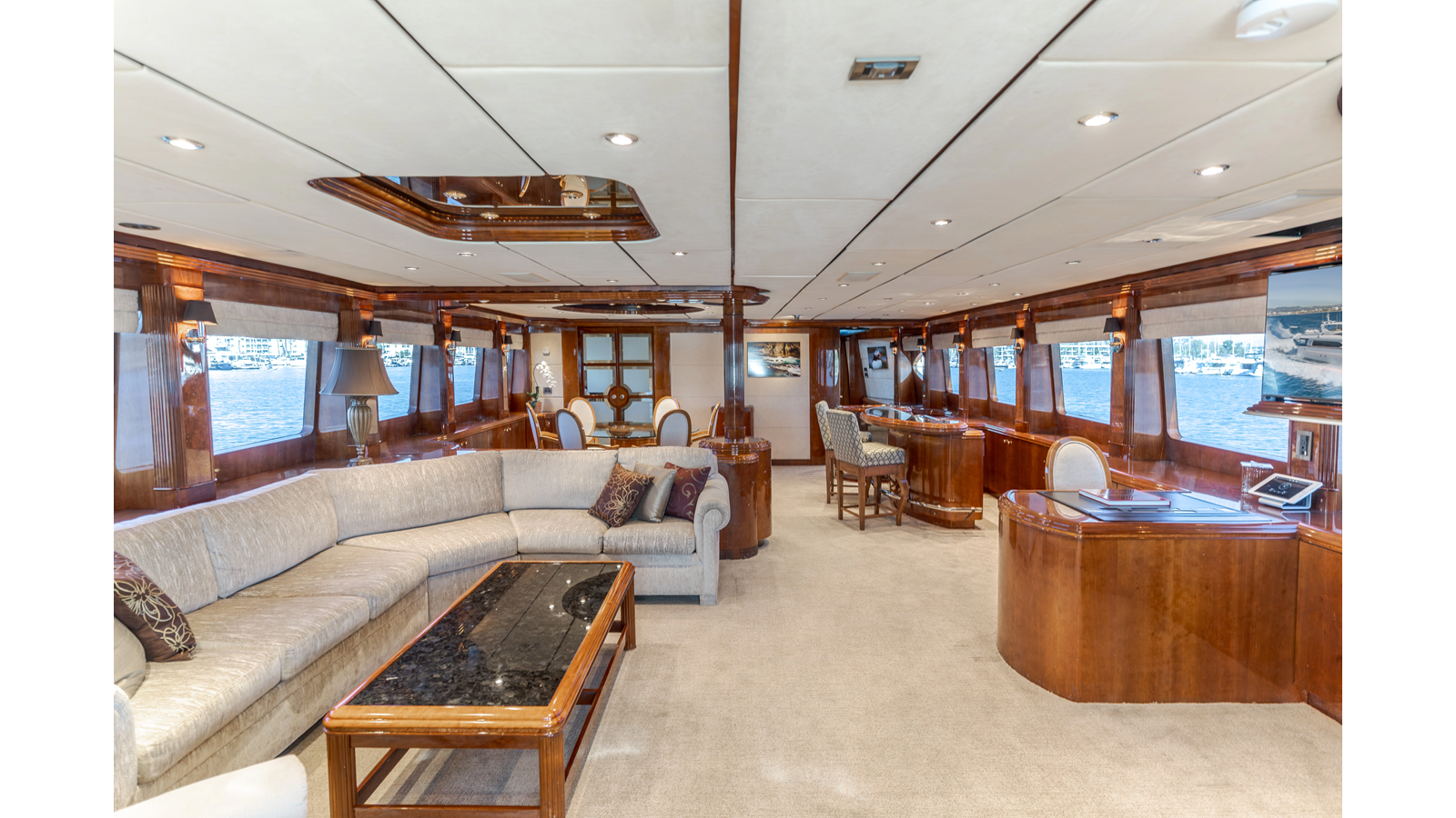 The interior exudes enduring luxury with high-gloss joinery and a refined crème-and-beige palette. The main salon flows seamlessly into a formal dining area and bar, ideal for entertaining while the chef-ready galley boasts updated Bosch and GE appliances, generous counter space, and elegant French doors with etched glass.