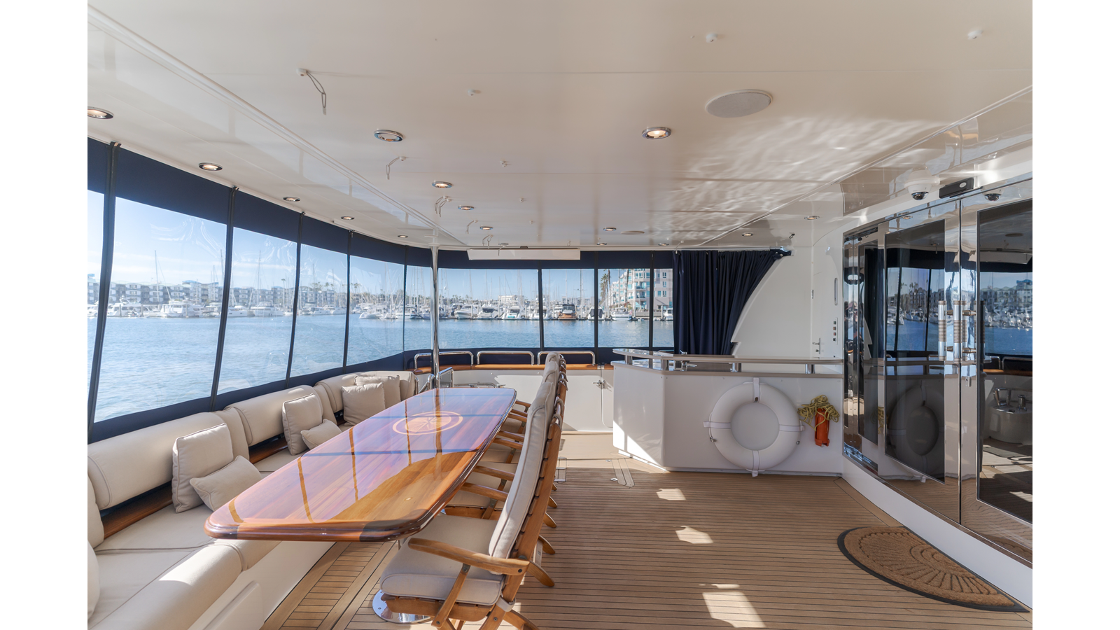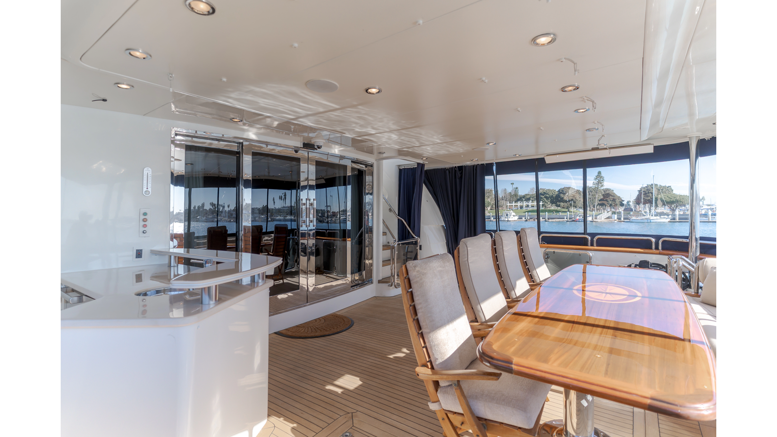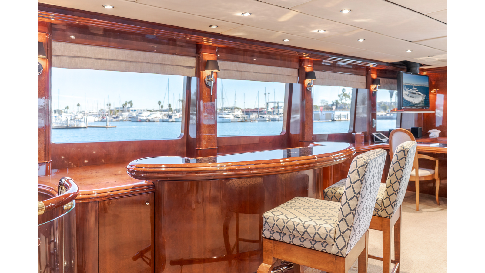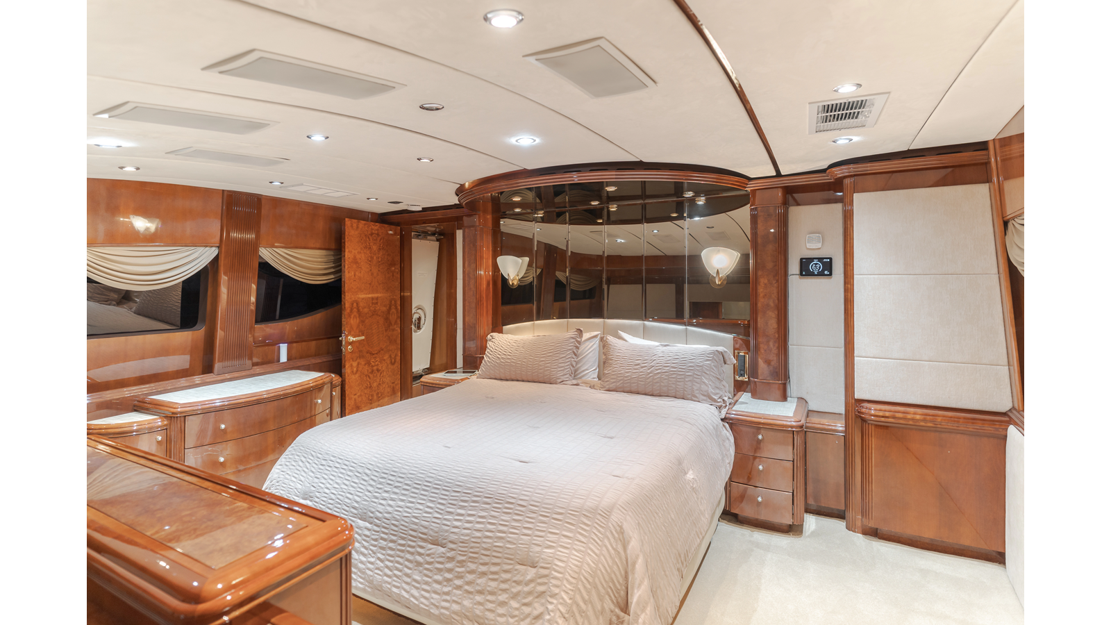 The interior exudes enduring luxury with high-gloss joinery and a refined crème-and-beige palette. The main salon flows seamlessly into a formal dining area and bar, ideal for entertaining while the chef-ready galley boasts updated Bosch and GE appliances, generous counter space, and elegant French doors with etched glass.