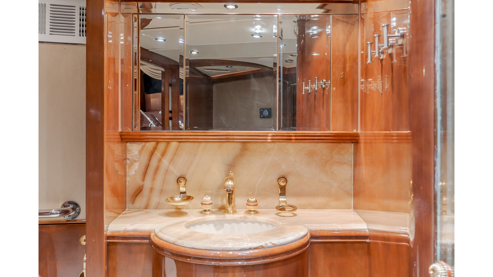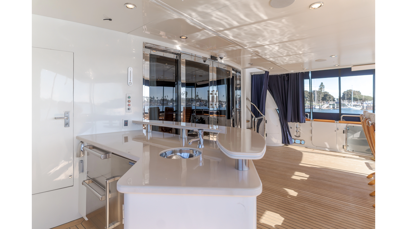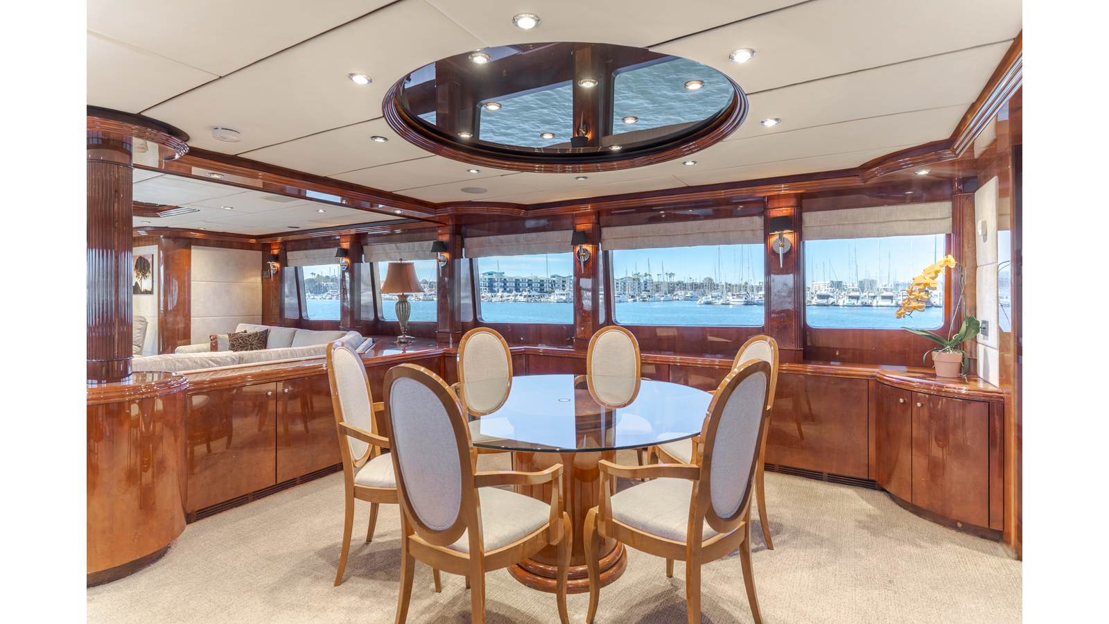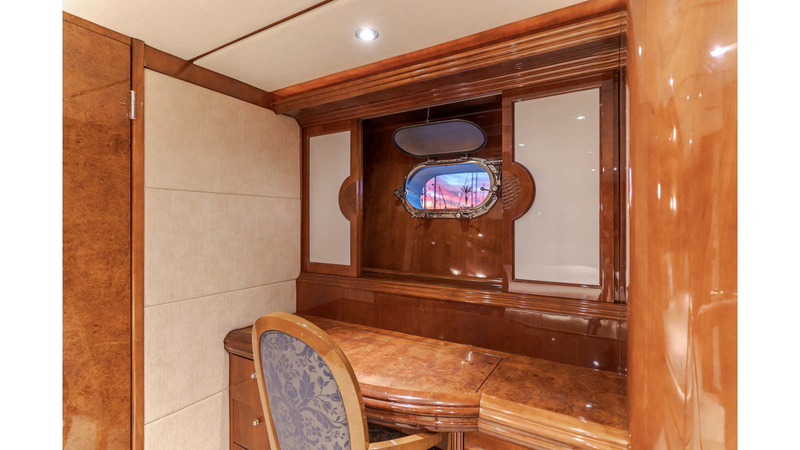 The interior exudes enduring luxury with high-gloss joinery and a refined crème-and-beige palette. The main salon flows seamlessly into a formal dining area and bar, ideal for entertaining while the chef-ready galley boasts updated Bosch and GE appliances, generous counter space, and elegant French doors with etched glass.